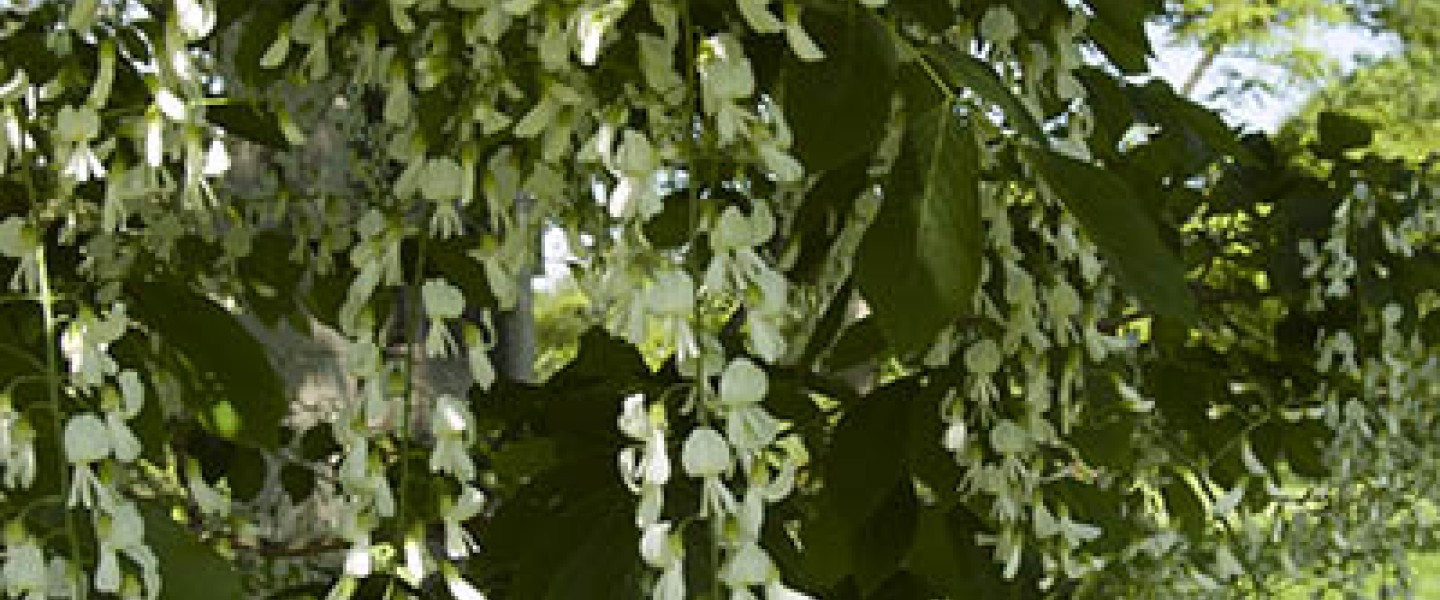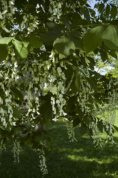 Usually a low-branching tree with a broad, rounded crown of delicate branches reaching 30' to 50' in height, 40' to 55' wide. Bark on older branches and trunks very smooth, gray and beech-like in overall appearance and texture. Flowers perfect, white, fragrant, 1" to 1 1/4" long, borne in 8" to 14" long, pendulous terminal panicles from May to early June; tends to flower more profusely in alternate years, or every third year. Fall color yellow to golden-yellow; fruit a brown, 2 1/2" to 4" long, 1/2" wide pod, maturing in October.
