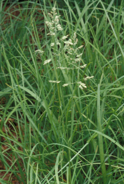 Culms to 40 cm in height; leaves to 4 mm wide, usually flat, glabrous, the uppermost 4-8 cm or more above the middle of the stem. Inflorescence to 10 cm long, lax, grayish or whitish.