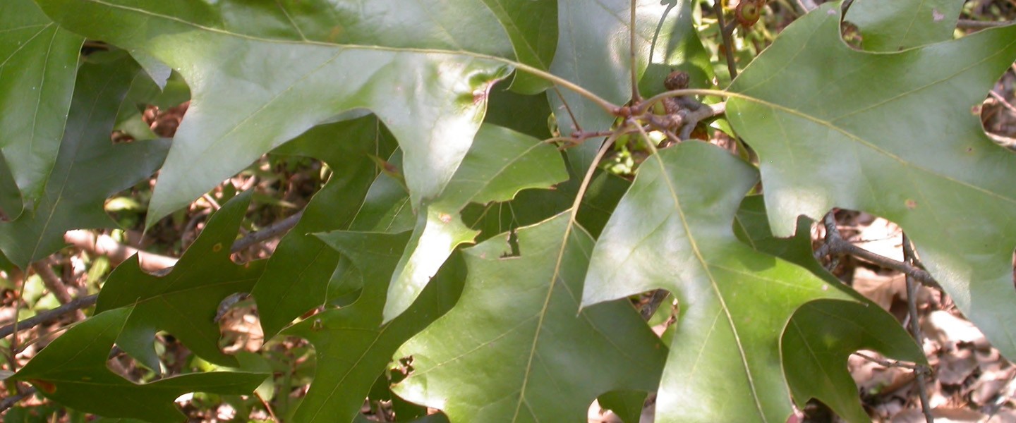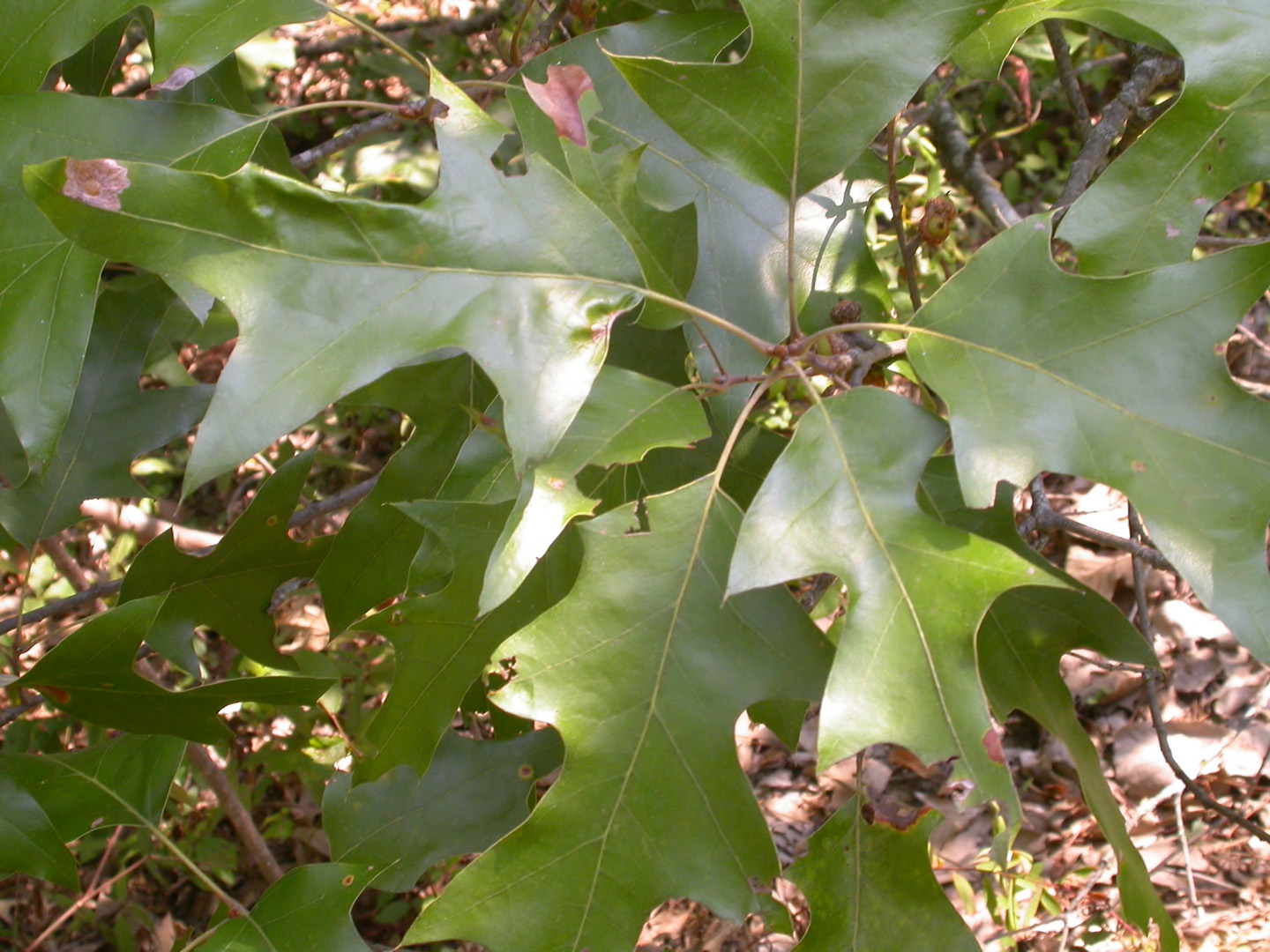 Deciduous tree to 20-30m, rarely to 45m. Bark black-brown, deeply fissured, fissures orange at center. Young branchlets brown-tomentose becoming glabrous, red-brown. Leaves 6-25 — 4.5-15.5cm, narrowly ovate to obovate, often misshapen, apex acute, base truncate, margin deeply 5 or 7 lobed, lobes ovate to triangular, 1-3 bristle-tipped teeth, dark , glabrous and glossy above, paler, densely tomentose at first beneath, becoming scurfy with a few hairs in nerve axils; petiole 2.5-7cm. Acorns ripe in second year, solitary or paired, 1.5-2.5cm, ovoid to subglobose, pale brown; cupules made up of loosely overlaping hairy scales, enclosing half of acorn.