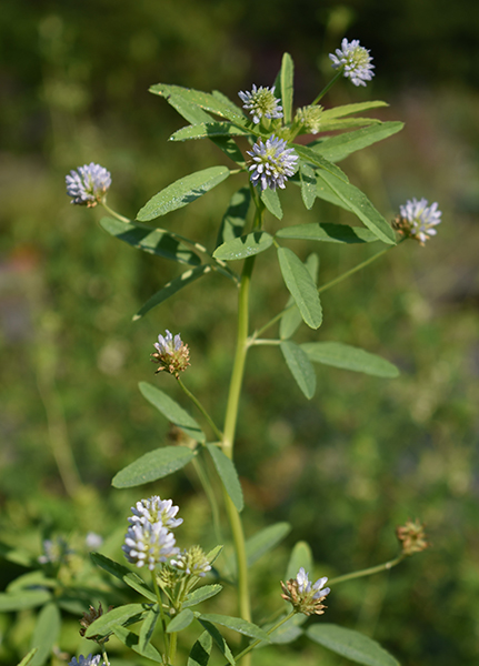 Slender annual to 60cm. Leaflets ovate or round near base, toothed; stipules lanceolate, toothed at base. Flowers blue and white in dense, long-stalked, globose heads. Fruits thombic-ovate, long beaked.