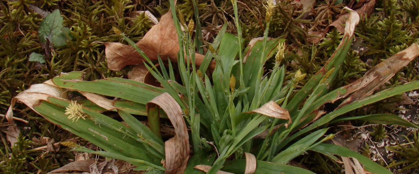 Tufted 2-4 dm, the fertile stems lateral, roughened on the angles; basal sheaths white or light brown; leaves smooth, somewhat glaucous, those of the sterile shoots 10-25mm wide, of the fertile shoots 2-6mm wide; terminal spike staminate, 0.6-1.5cm, on a peduncle 1-8mm; pistillate spikes 2-4, 0.6-1.5cm, scattered, the lowest one basal; pistillate scales apiculate or with an awn to 2mm; perigynia 2-9, overlapping, 3-4.5mm, finely many-nerved as well as 2-ribbed, sharply trigonous, elliptic in outline, rather abruptly contracted to the short, erect or outcurved beak with entire orifice; achene sharply trigonous.