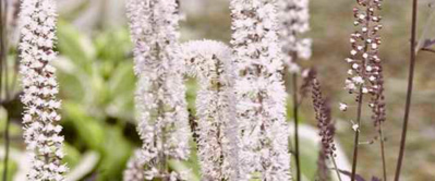 Plants form 2' tall mounds of deep coppery-purple foliage topped by 6' stems carrying spikes of creamy-white flowers, effective in fall.