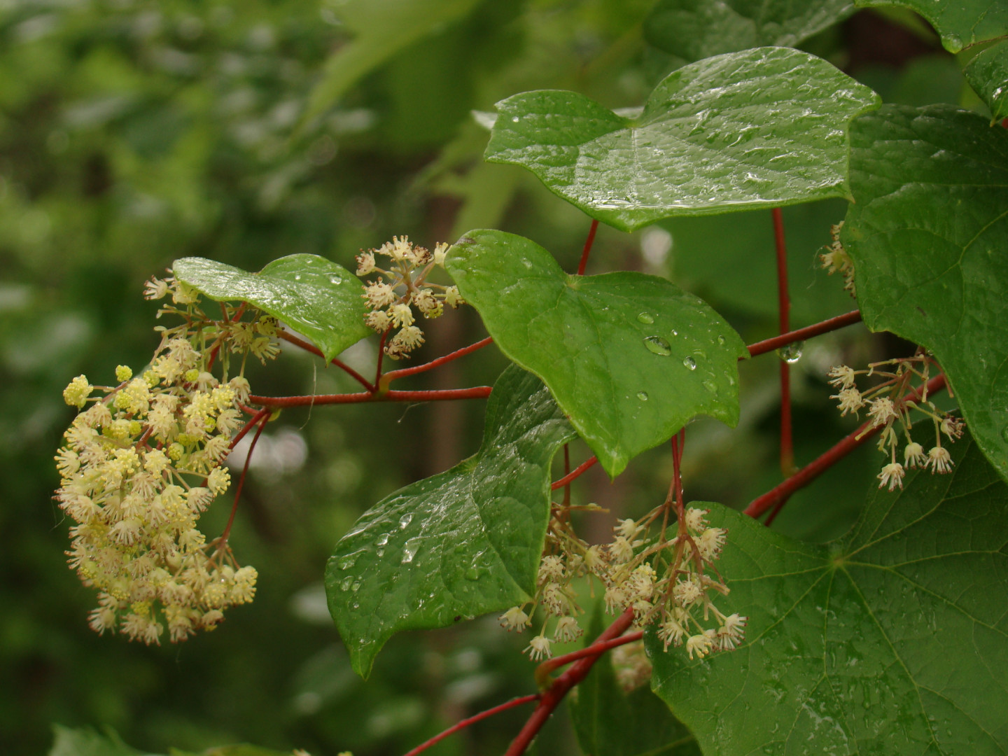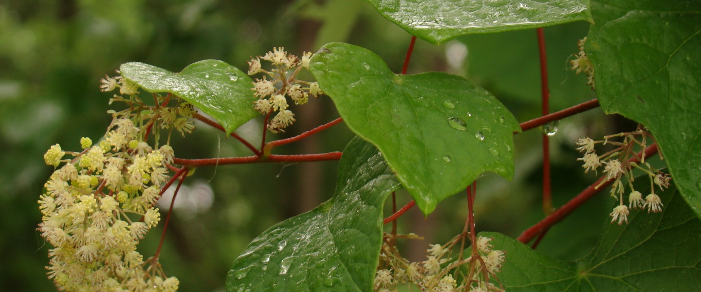 Canada moonseed flowers are likely pollinated by small bees and flies. The caterpillars of the moonseed moth (Plusiodonta compressipalpis) sever the leaves and feed on them after they become dry, while the larvae of a long-horned beetle, Hyperplatys aspersa, bore underneath the bark. The fruit are eaten by several woodland bird species.