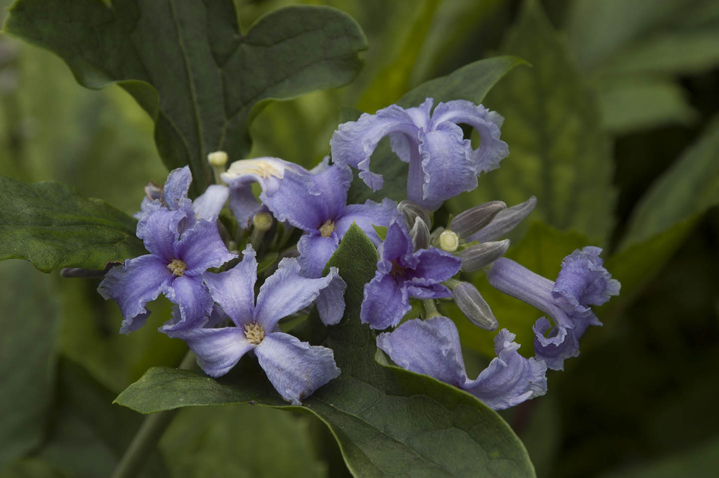Seedling descendents of C. tubulosa 'Wyevale', a selection made for its large, frilled, fragrant blue flowers, borne in axillary as well as terminal clusters. The seedlings have overwhelmingly resembled the original parent, varying mostly by shade of blue and degree of frilling on the flower. Species description: Climbing shrub. Leaves petiolate, divided with 3 leaflets, leaflets ovate to rhomboidal, sharply serrate. Inflorescence paniculate-corymbose, axillary, sessile or shortly pedunculate; flowers campanulate; sepals pale blue-lilac, slightly recurved at tips. (DS 350)