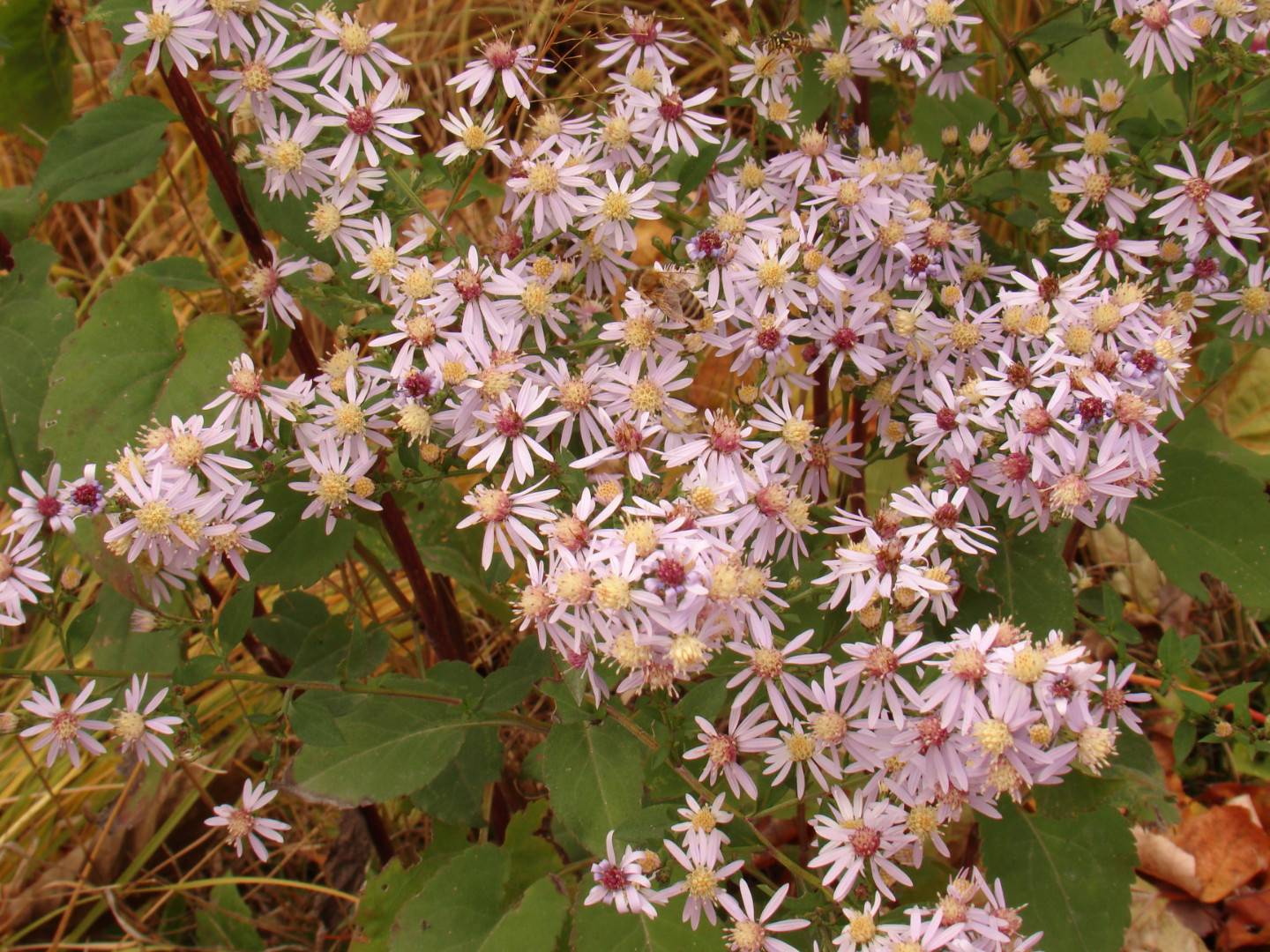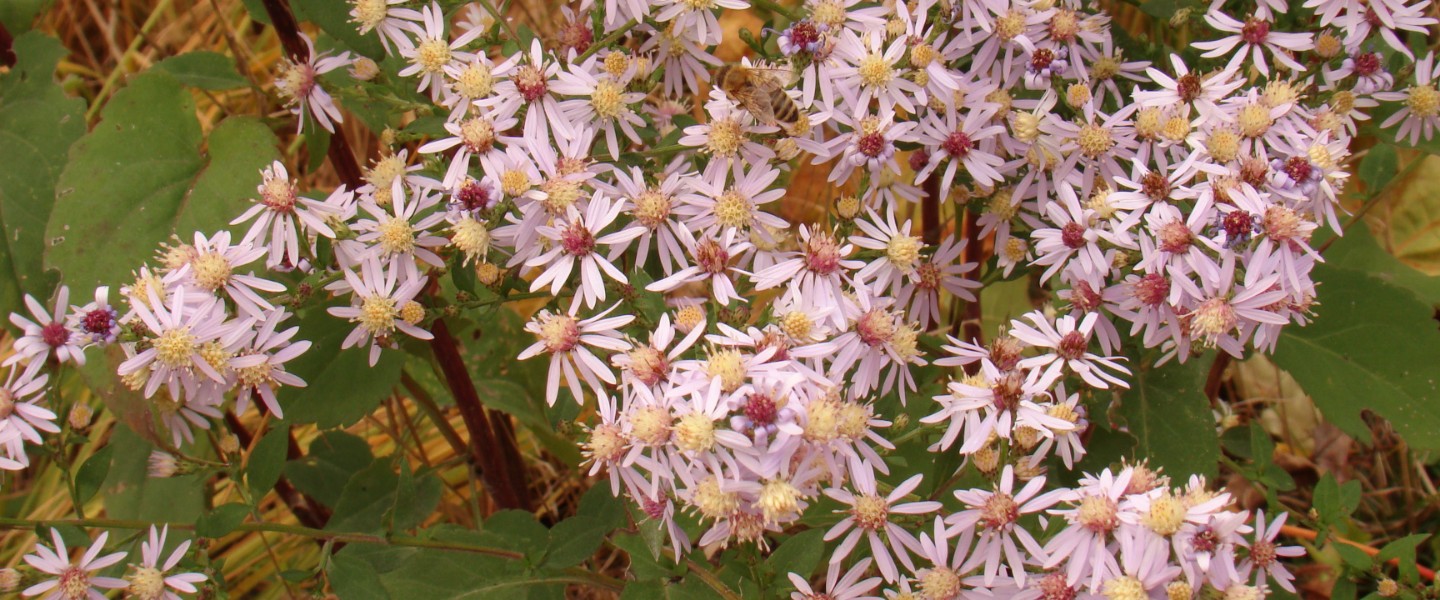 Heart-leaved blue aster flowerheads attract many kinds of insects, including long-tongued bees, short-tongued bees, wasps, flies, butterflies, skippers, and beetles. Many insects feed on the foliage, including leaf beetles, the larvae of leaf-mining flies and fruit flies, plant bugs, stink bugs, lace bugs, aphids, leafhoppers, and the caterpillars of several butterfly and moth species. Other wildlife use asters to a limited degree. Ruffed grouse, wild turkey, and tree sparrows eat the leaves and/or seeds, as do mammals like chipmunks, white-footed mice and white-tailed deer.