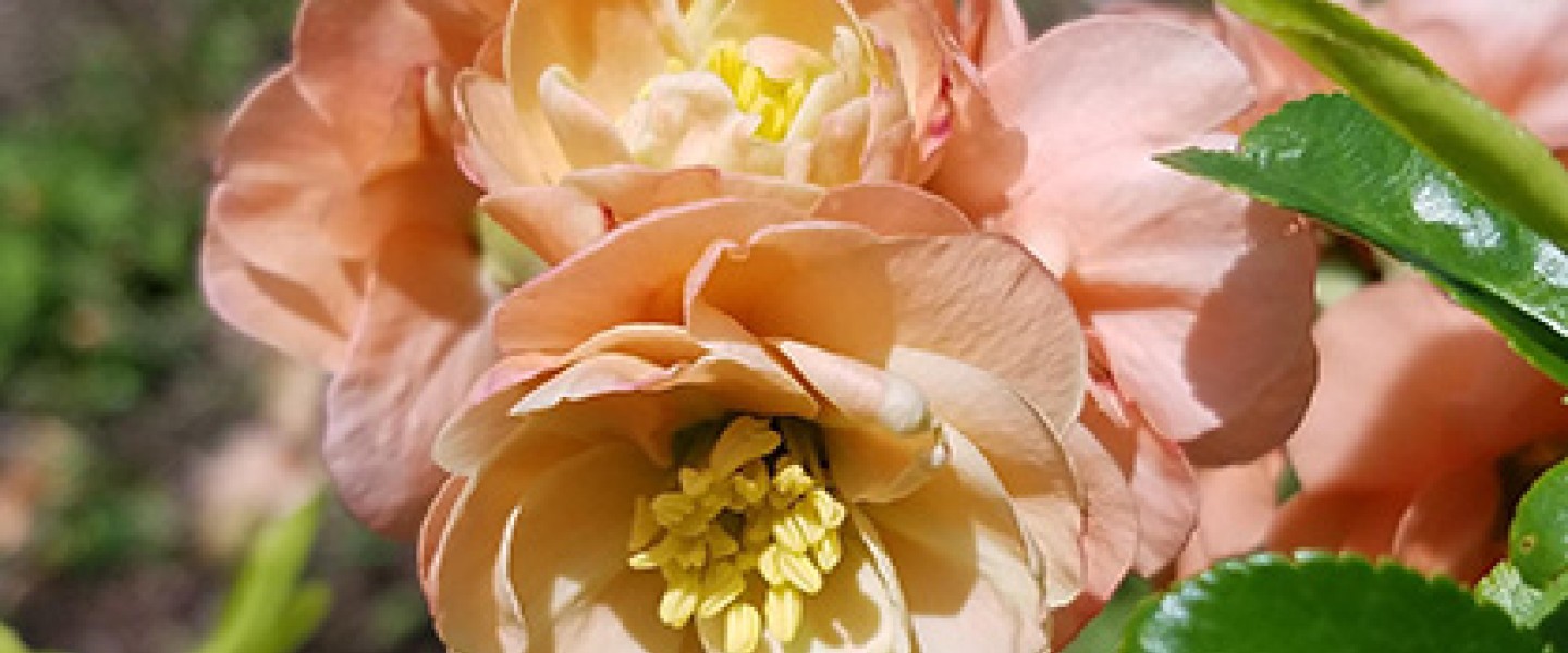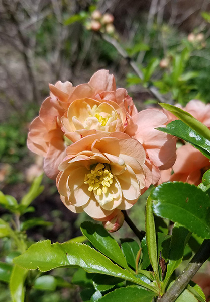 Rounded shrub reaching 4-5' in height bearing double, apricot-pink flowers in profusion in spring; flowers later than most cultivars, often with the emerging leaves which are a vivid refreshing green and show better resistance to bacterial leaf blight than most cultivars.