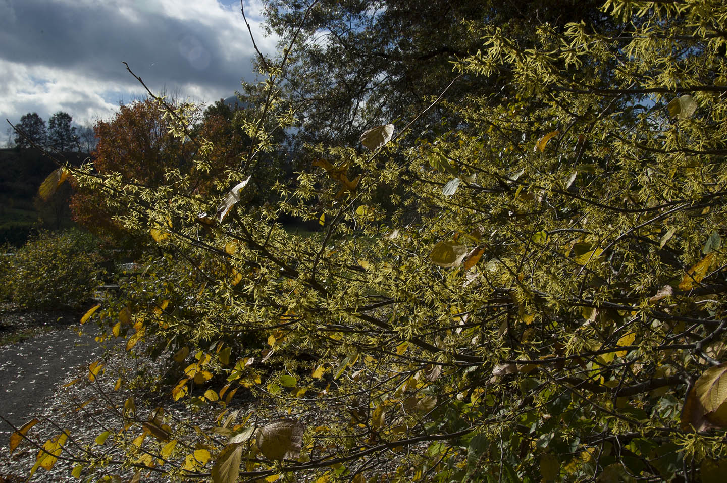 Small tree or large shrub with several large, crooked, spreading branches forming an irregular, rounded, open crown, reaching 20' to 30' in height and 15' to 20' in spread. Fall color a good yellow; can bespectacular. Flowers yellow, fragrant, composed of four strap-like petals 3/4" to 4/5" long; calyx lobesare yellowish brown inside. Flowers borne in 2- to 4-flowered cymes in mid-October or later; plants areoften in full fall color at time of flower, thus reducing the efffectiveness of the floral display. Blooming period lasts 2 to 4 weeks, depending on weather conditions.