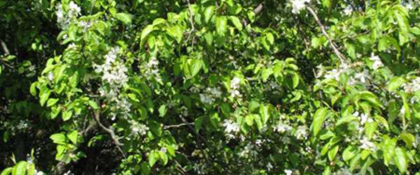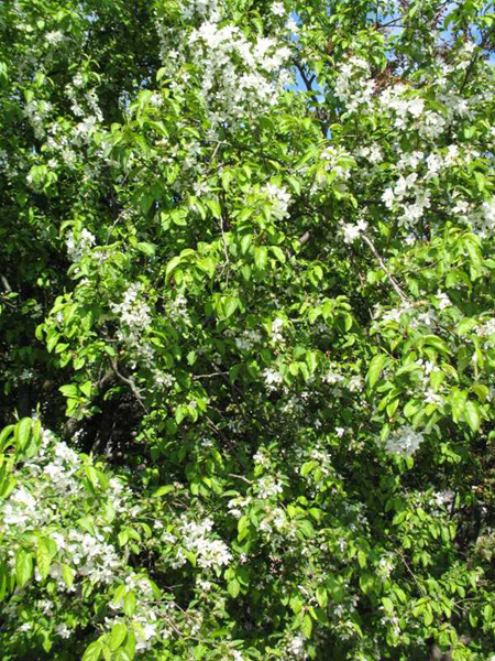 Rounded tree reaching 20' in height and width. Leaves dark green. Flower buds pink opening to single, white flowers 1.8" across. Fruit glossy, bright red, 0.4" across, profuse, persistent. Subject to moderate scab and severe fire blight (Nichols).