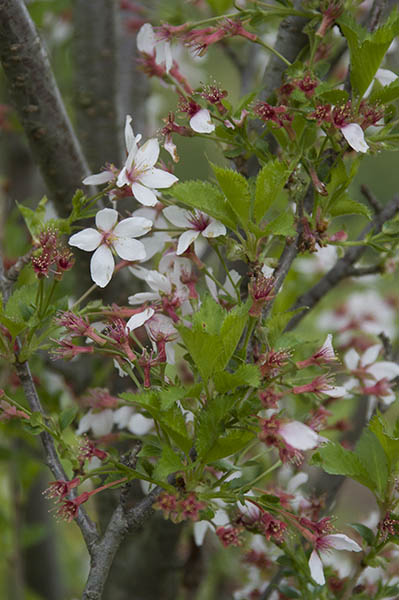 Generally shrubby, but occasionally a small tree, blooming profusely in March. Leaves small, inciselytoothed, beautifully tinted in autumn. Flowers small, white, pink tinged in bud and appearing pink at adistance; fruits only occasionally produced, small, purple-black.