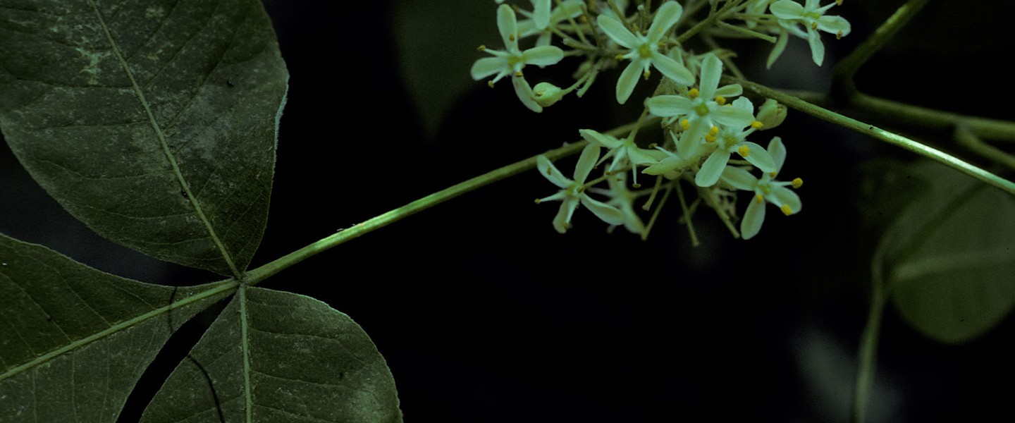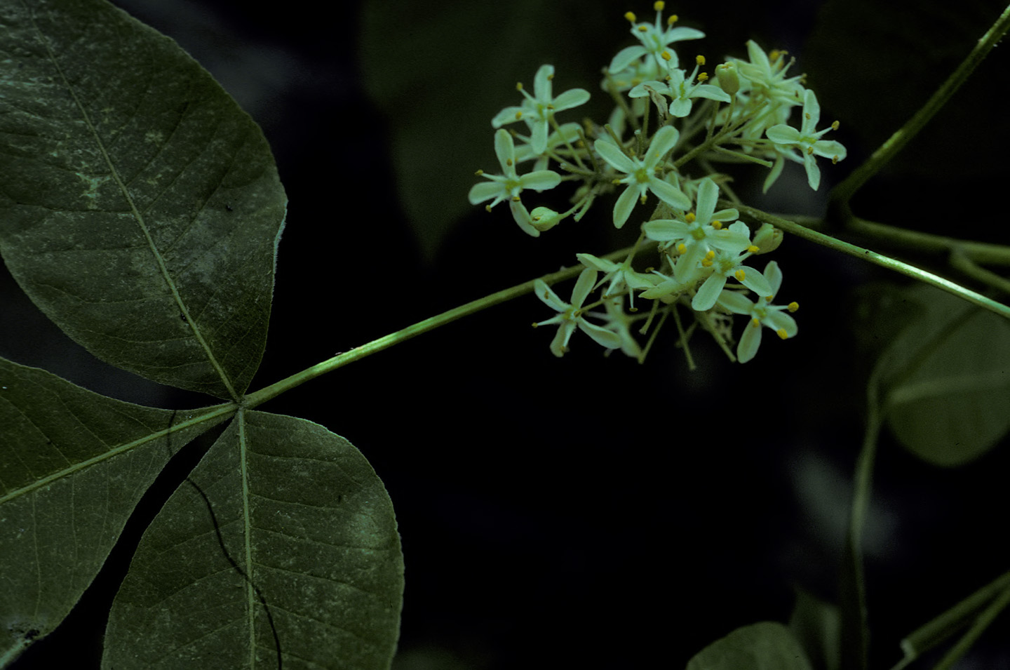 A large shrub or small tree of a bushy, rounded natrue; if tree-like, usually low-branched; has a tendency to sucker. Leaves are alternate, trifoliate, leaflets ovate to elliptic-oblong, 2.5 to 5" long, narrowed at ends, sometimes acuminate, middle largest with a short petiolule, the lateral ones oblique at base, smaller, entire, or obscurely crenulate, sessile, lustrous dark green above and glabrous below; if viewed with a hand lens while back-lighted distinct oil-glands are evident; pungent when bruised; petiole 2-4" long. Fall color can be a good yellow. Flowers are small, unisexual, greenish white, 1/3 to 1/2" diameter, fragrant, borne in terminal, 2-3" diameter corymbs on short lateral branches, in late May to June. Fruits are compressed, broadly winged, suborbicular, 2 sided, to 1" diameter indehiscent samaras; brownish at maturity, rather conspicous; effective August through September.