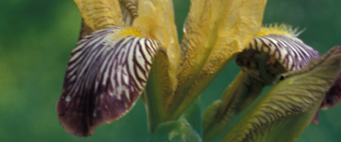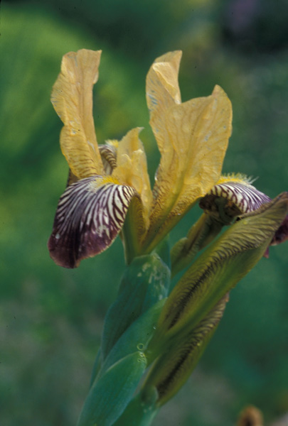 Rhizomatous herbaceous perennial to 40cm tall, with narrow, dark leaves and up to 6 flowers, 6-7cm wide, with pale yellow standards and white falls heavily veined with deep purple; beard yellow