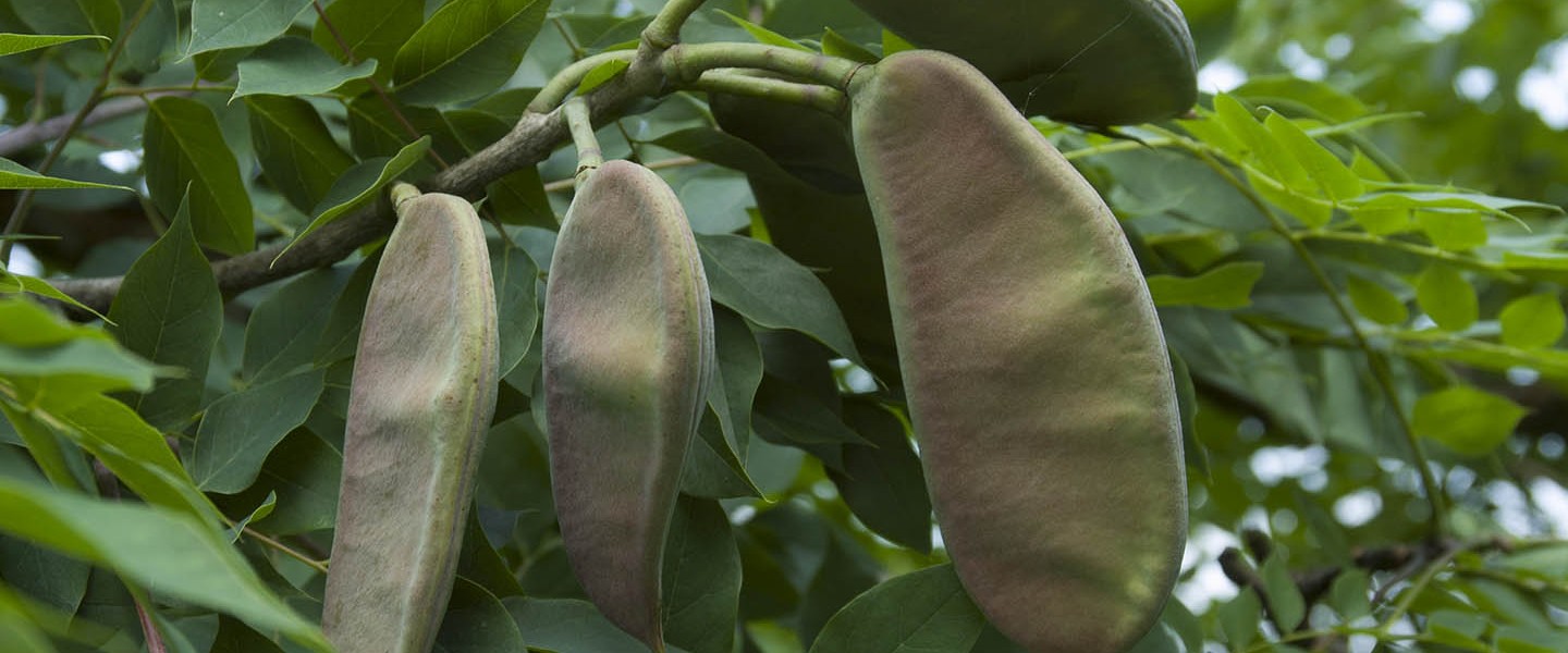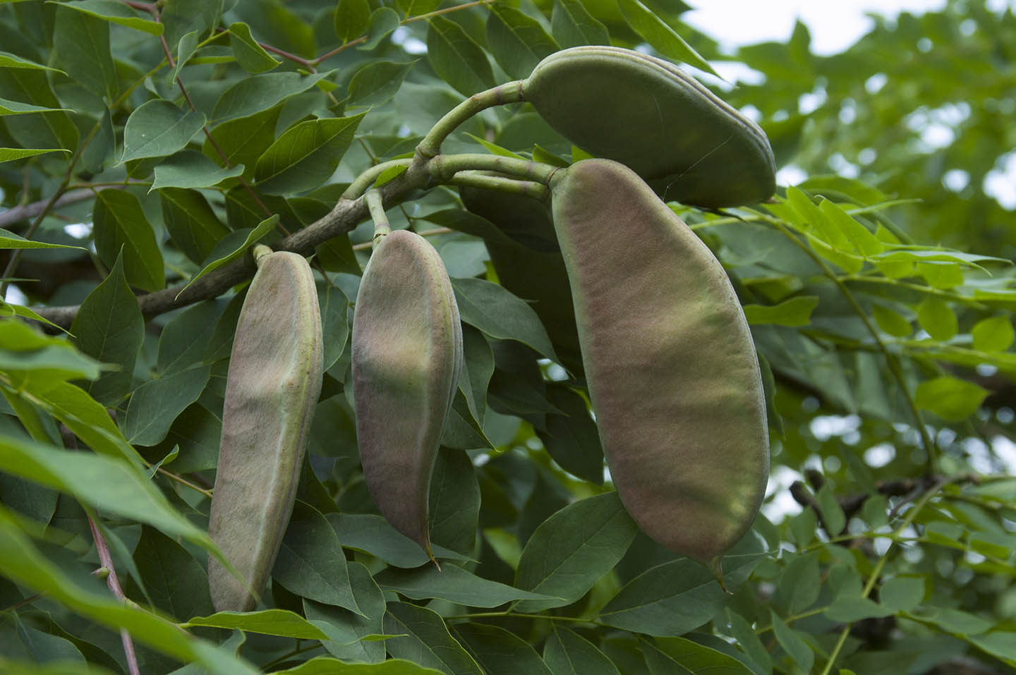 Tree reaching 60' to 75' (to 90') in height with a spread of 40' to 50' with vertical ascending brancheswhich form a narrow, obovate crown; bare-limbed and somewhat clumsy looking, although picturesque, in winter. Bark rough, with hard, thin, firm and scaly ridges curling outward aong their edges; very uniqueand interesting bark pattern which develops on 1" to 2" diameter branches; bark grayish to dark brown. One of the last trees to leaf out in spring; new leaves are pinkish tinged, gradually changing to dark green, almost dark bluish-green in summer; fall color is often ineffective, although it can be an excellent yellow. Flowers dioecious to polygamo-dioecious, greenish-white, effective in late May into early June,borne in 8" to 12" long, 3" to 4" wide pyramidal panicles on female trees, while on male trees the panicle is about 1/3 the length of the female's. Female flowers with rose-like scent.