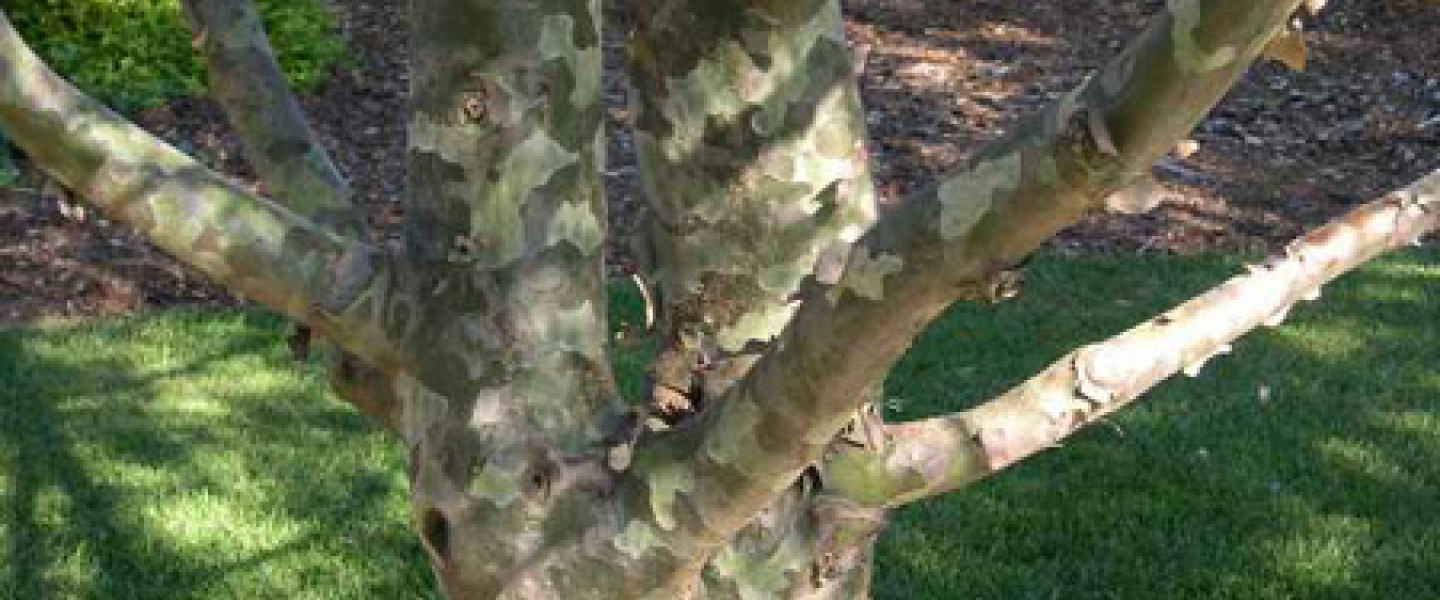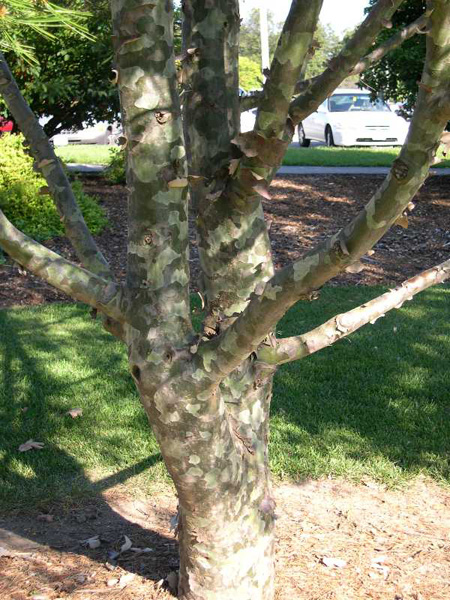 Pyramidal to rounded, often with many trunks in youth, becoming open picturesque, flat-topped and spreading with age. Needles in 3's, held 3 to 4 years. Bark exfoliating in patches like a plane tree, young stems greenish with irregular whitish or brownish areas interspersed. One of the most handsome of pines for bark character.