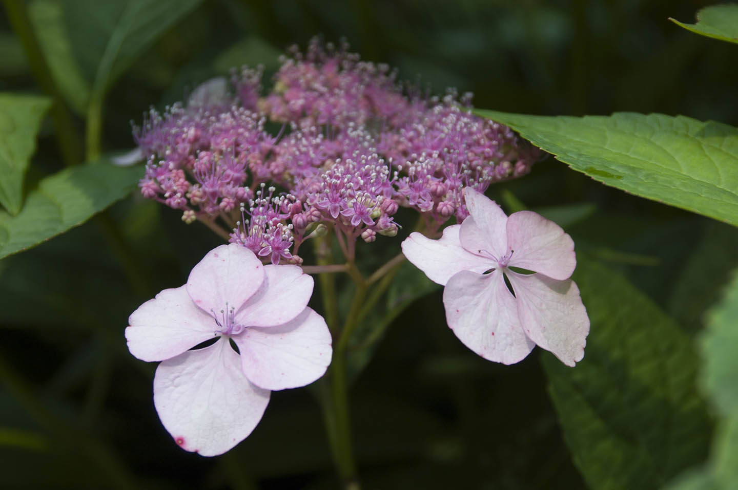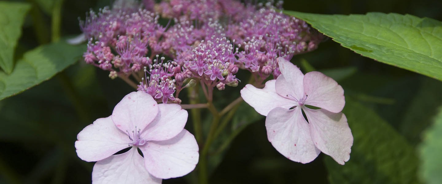 Pale pink or blue ray flowers; early-flowering, vigorous, reaching 5' in height, and drought resistant. H. serrata is July-August flowering (DS 9). A small robust shrub with stout shoots and abruptly acuminateleaves. The blue fertile flowers are borne in slightly dome-shaped corymbs, surrounded by large ray florets which are reddish-purple on chalk soils, and a lovely sea-blue on acid soils. Reputedly a select form of H. serrata acuminata, but in our experience the two are identical. A.M. 1960; A.G.M. 1969.