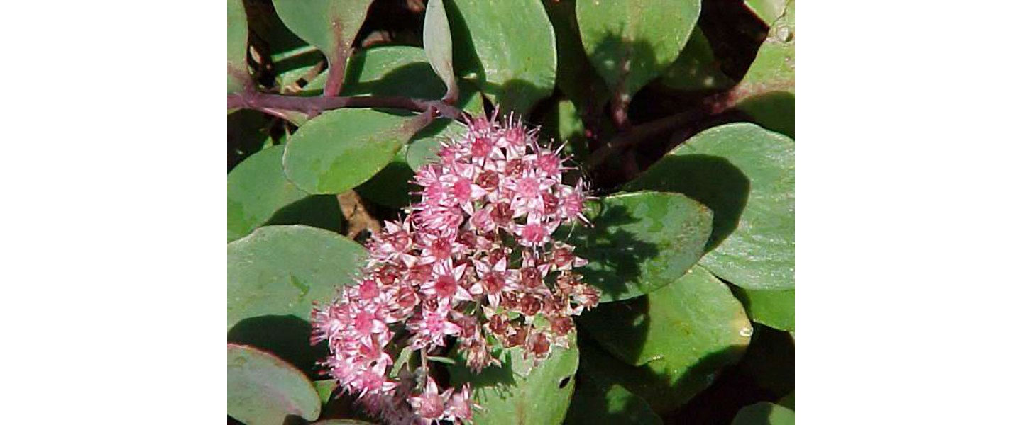 Plants reach 9" in height and width; glaucous purple foliage is topped in late summer by flower heads of dusky pink.