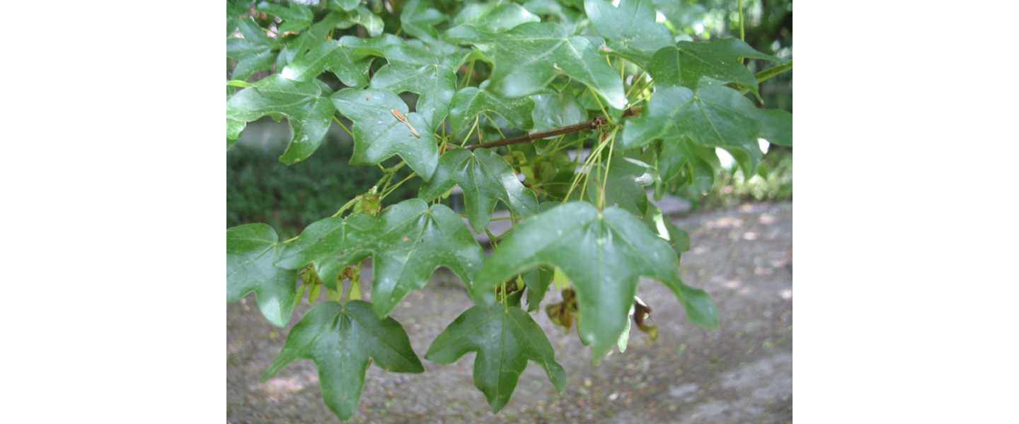 A large, dense shrub or small, densely branched tree, semi-evergreen to deciduous, 6-12 m tall with a rounded crown and glabrous, reddish-brown to gray branches. Leaves extremely variable, coriaceous, 3-lobed, obtuse, 3-5 cm across, dark green and shining above, glaucous beneath, turning yellow in fall. Flowers yellow-green, held in pendulous corymbs in April and May.
