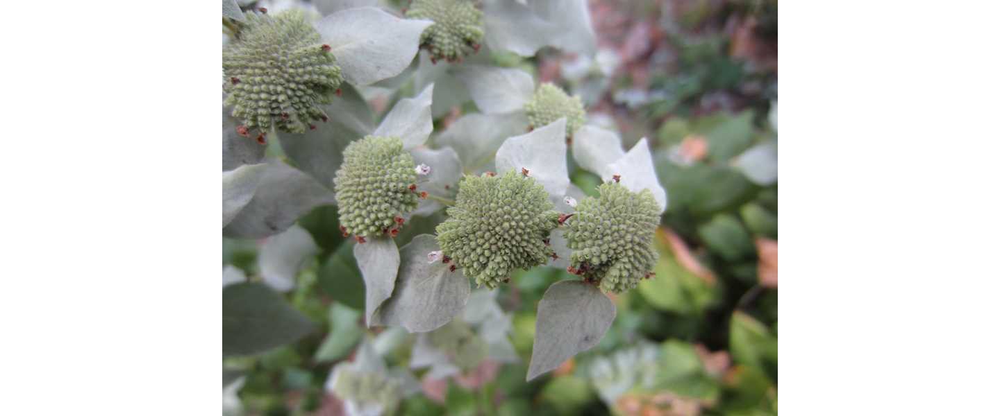 A 2-4' tall plant with silvery blue foliage that releases an intense mint fragrance when crushed. Produces flat-topped inflorescenses with pink flowerheads in July and August.