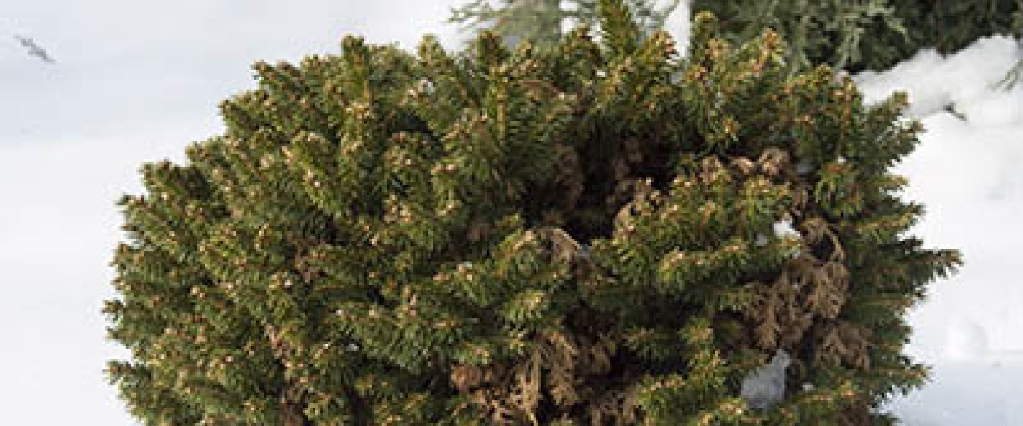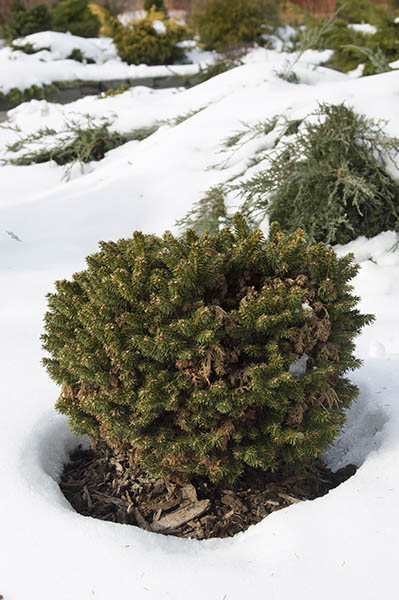 Dwarf form, oval, branches crowded, upright, twigs densely crowded and wide spreading, yellow-white, very small and thin, annual growth 5-10mm, buds very small, globose, enveloped by the needles, yellow-brown, lateral buds outspread; needles usually radially arranged on the branch tips, but more parted on the older shoots, 4-8mm long, light yellow-green with distinctly yellow tips, stiff and thick, often curved, somewhat sickle-shaped. Discovered in 1928 by Mrs M. Seiffert-Orff in upper Bavaria, Germany.