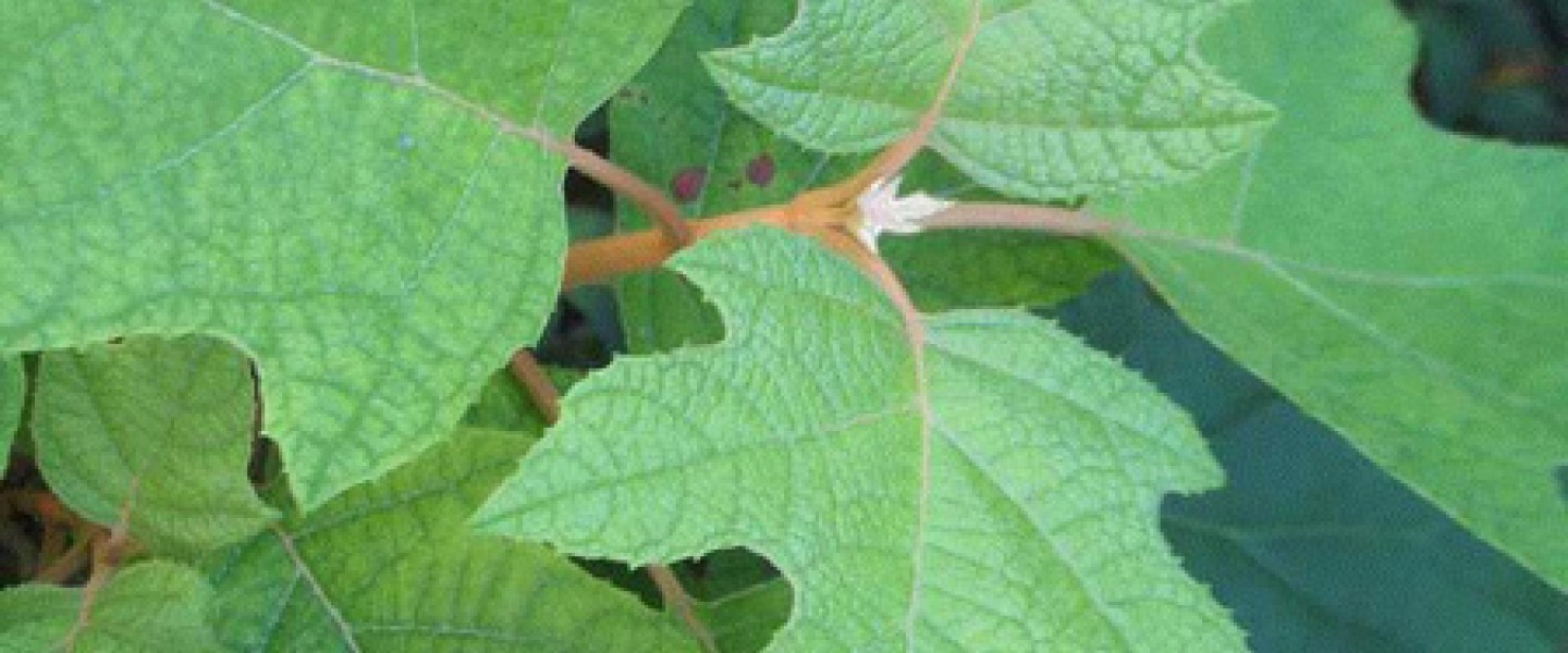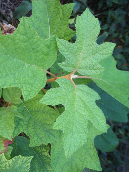 A seedling selection with compact habit, ball-like sterile flowers, and deep burgundy fall color.