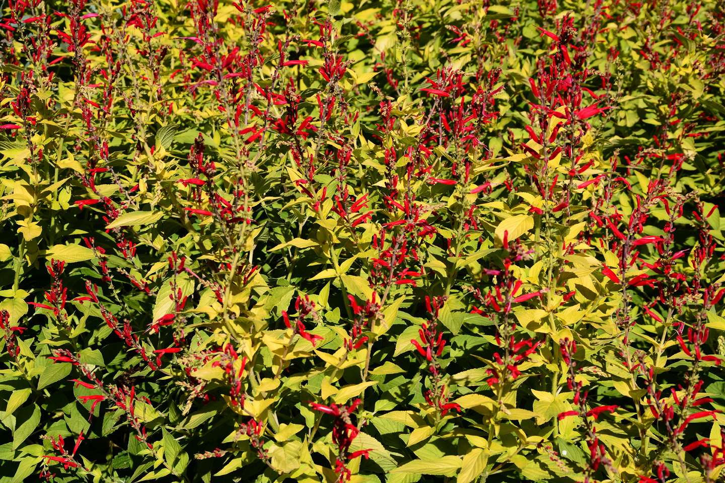 Bright, pineapple-scented yellow foliage with fire engine red flowers; very heat tolerant.