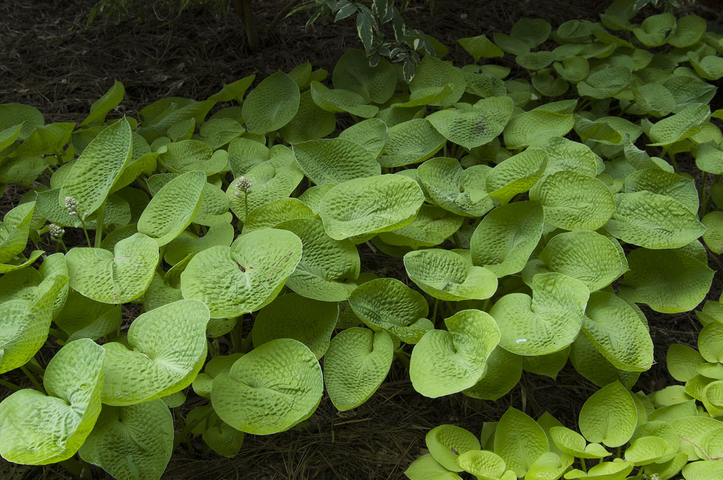 Upright grower of foreground size for specimen use. Round, intensely gold leaves have good substance and puckering, and a heavy sheen. It grows well with 1/2 shade to full sun (DS 111). Leaves rounded, cupped, and heavily puckered. Flowers pale lavender. Grows best in 1/4 to 3/4 sun. Hybridized by Paul Aden (DS 133).