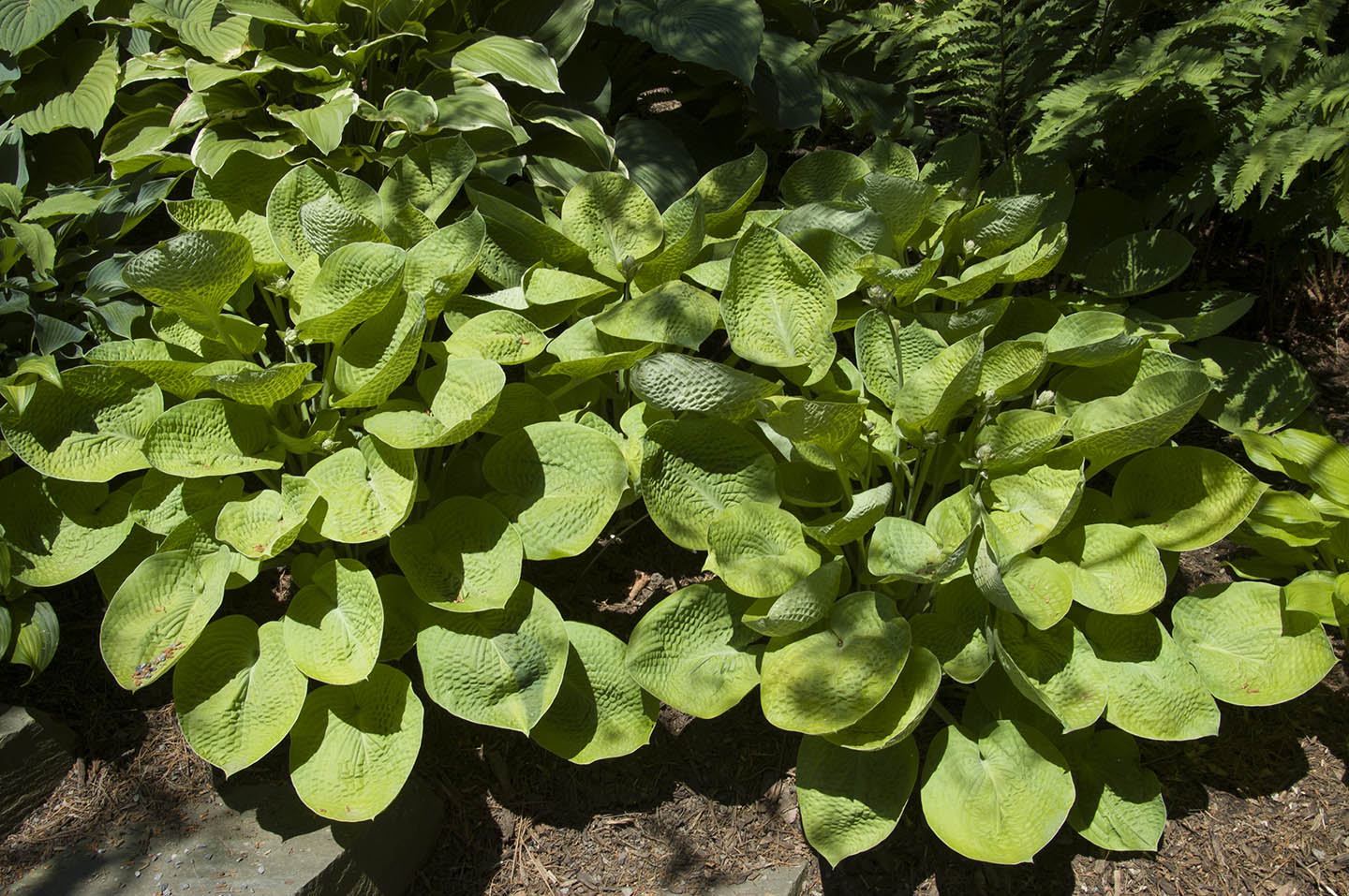 Plants reach 20" in height and 43" in width. Leaves are medium to bright gold, 9 1/4" long and 8 1/2" wide with a thin bloom on the upper surface and a thick bloom beneath, oblong-ovate with a heart-shaped base, heavily corrugated, with 16-17 pairs of veins and no purple dots on the petioles. Flowers are near white with a pale lavender petal midrib, 1 3/4" long, held 16"-24" tall scapes from late June into early July. Similar cultivars include 'Gold Cup', 'Golden Bullion', 'Golden Medallion', 'Golden Nugget', 'Golden Rajah', and 'King Tut'.