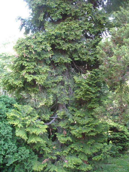 20-50 m tall acutely conical tree with short, horizontally spreading branches and nodding branch tips. Bark reddish-brown with rounded scaly plates. Branchlets flat, in an even plane, needles appressed, more or less acute, the lateral leaves keeled with a distinct tip, the facial leaves much smaller, rhombic, often with a gland, the underside with indistinct white lines; cones numerous, small, globose, 8 mm thick, blue-green at first, ripening in the first fall, then becoming brown, 8 scales with compressed papillae.