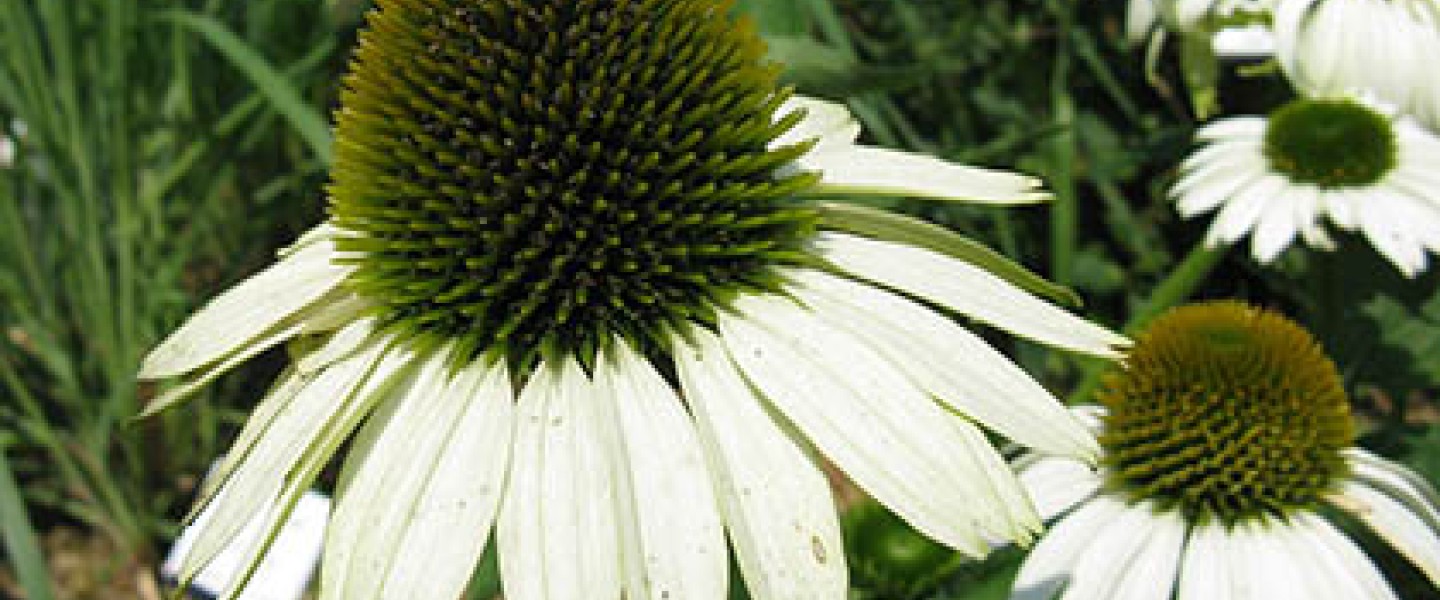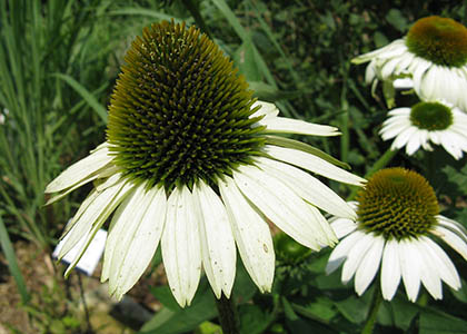 'Primadonna White' is an upright, widely-branched, clump-forming, single-type, white-flowered coneflower that typically grows to 30-36" tall on sturdy stems that usually do not need staking. Large daisy-like flowers (each to 3-5" diameter) appear in a floriferous bloom from late spring to late summer, sometimes with additional sporadic bloom until frost. Each flower features slightly drooping bright white rays that surround an orange-brown center cone. Strigose, narrow-ovate leaves (to 4" long) with serrated margins are medium green.