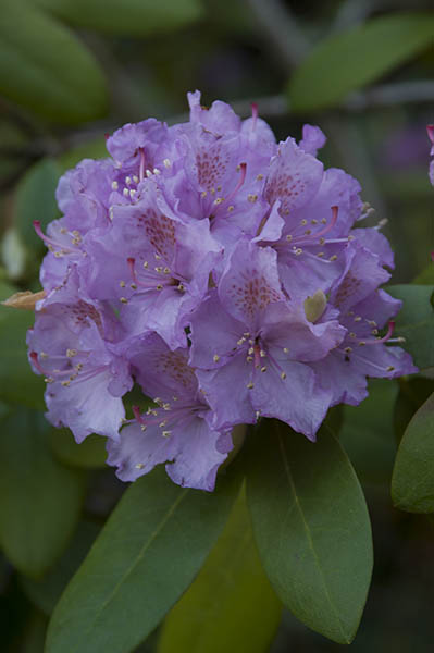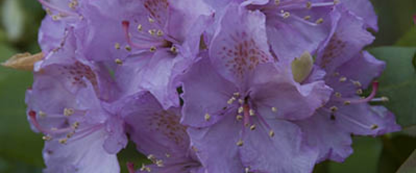To 5' in height; hardy to -10 degrees F.; midseason blooming; ARS rating 3/4/4. Sturdy and bushy growth habit; glossy dark green foliage. Flowers of light bluish lavender with faint brown blotch, about 2" (5cm) wide, slightly ruffled, held in rounded trusses. Easy to propagate. (Anthony M. Shammarello).