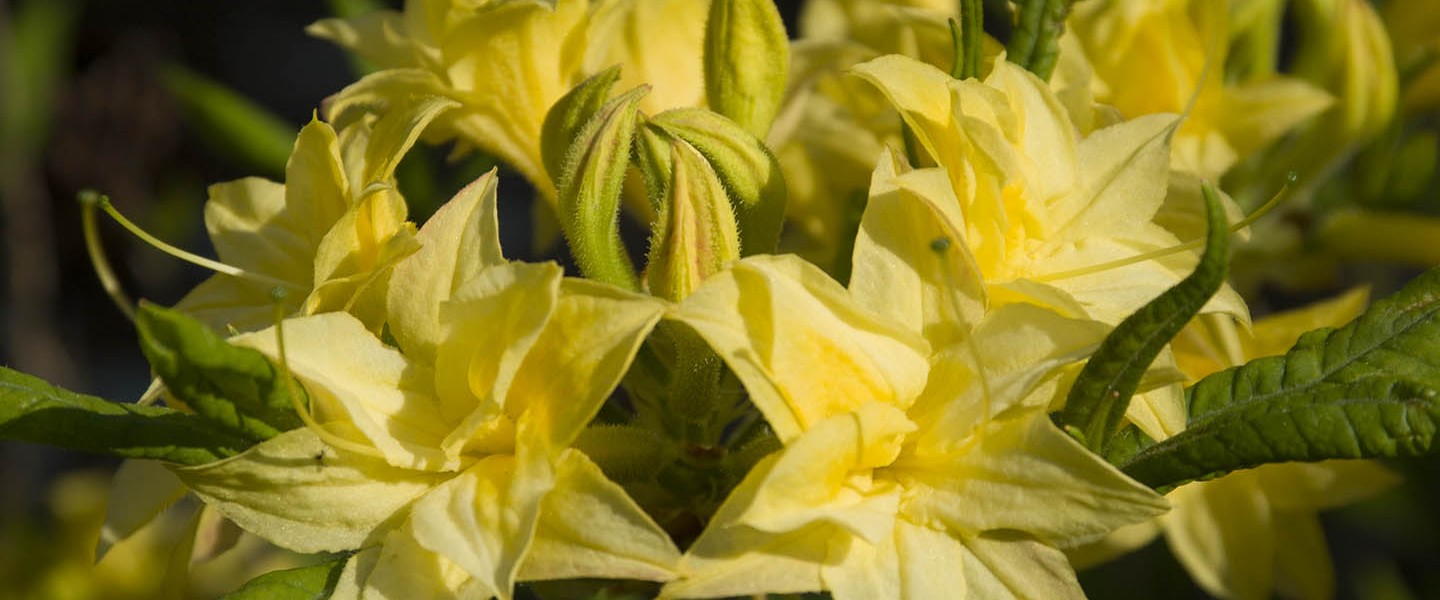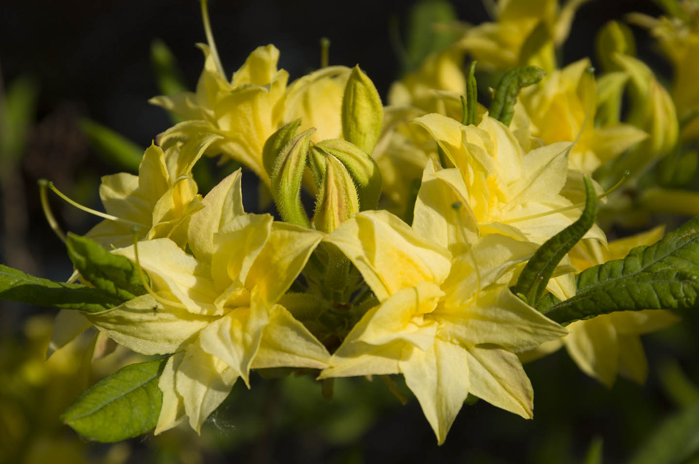Compact medium-sized shrub with foliage turning bronze-purple in autumn. Flowers funnel-shaped, fragrant, hose-in-hose, soft pale yellow, darker outside and in the throat.