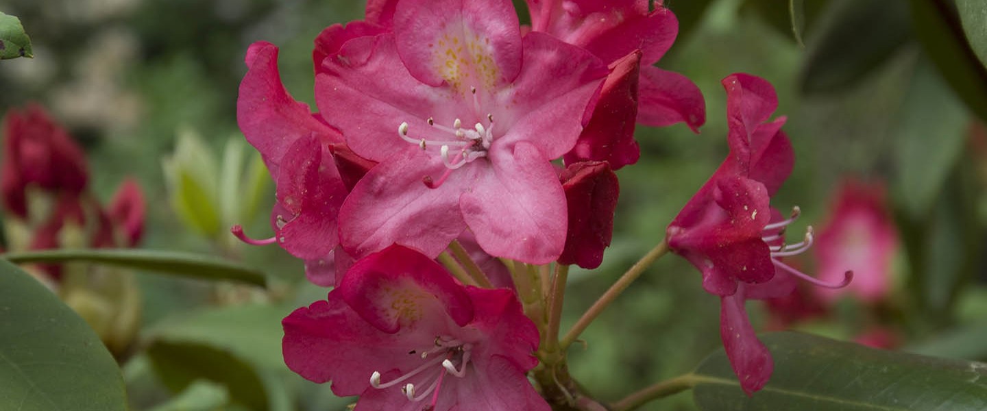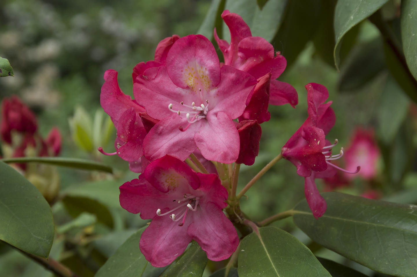 To 5' in height; hardy to -20 degrees F.; late season blooming. Flowers bright red shading pink towards an almost white center with a yellow dorsal flair, held in full pyramidal trusses. Leaves large and wavy-margined.