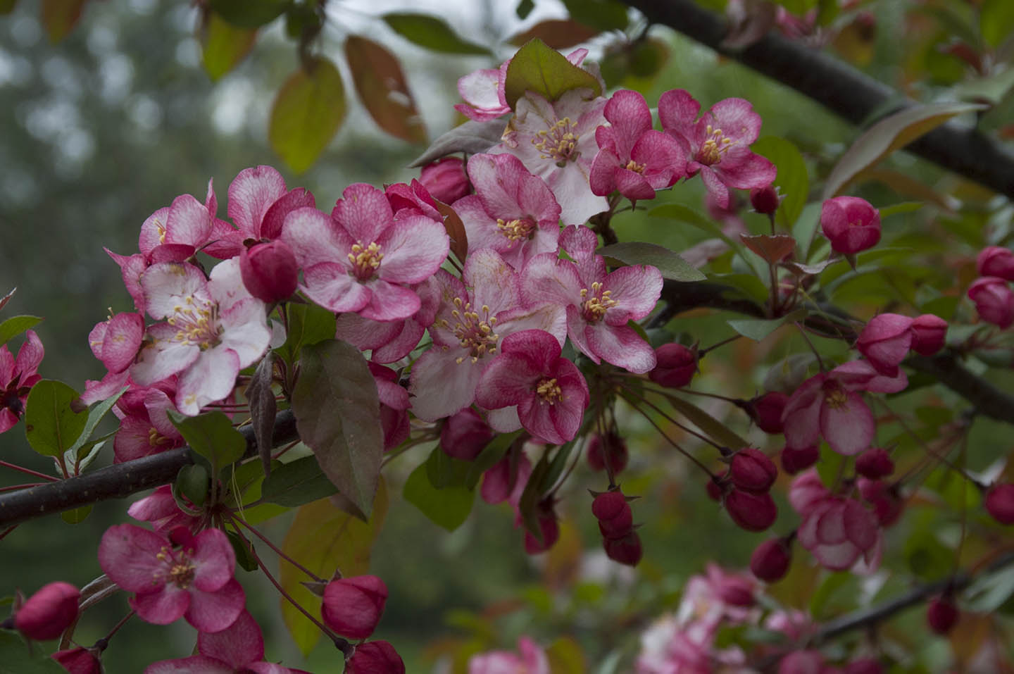 Small but vigorous picturesque tree with horizontal branching; leaves purplish; flowers carmine in bud opening to single pink flowers with carmine petal edges. Fruit dark reddish-purple. Disease resistant.