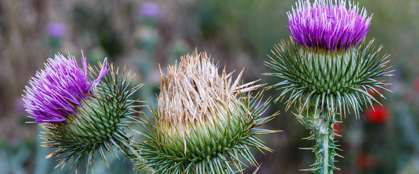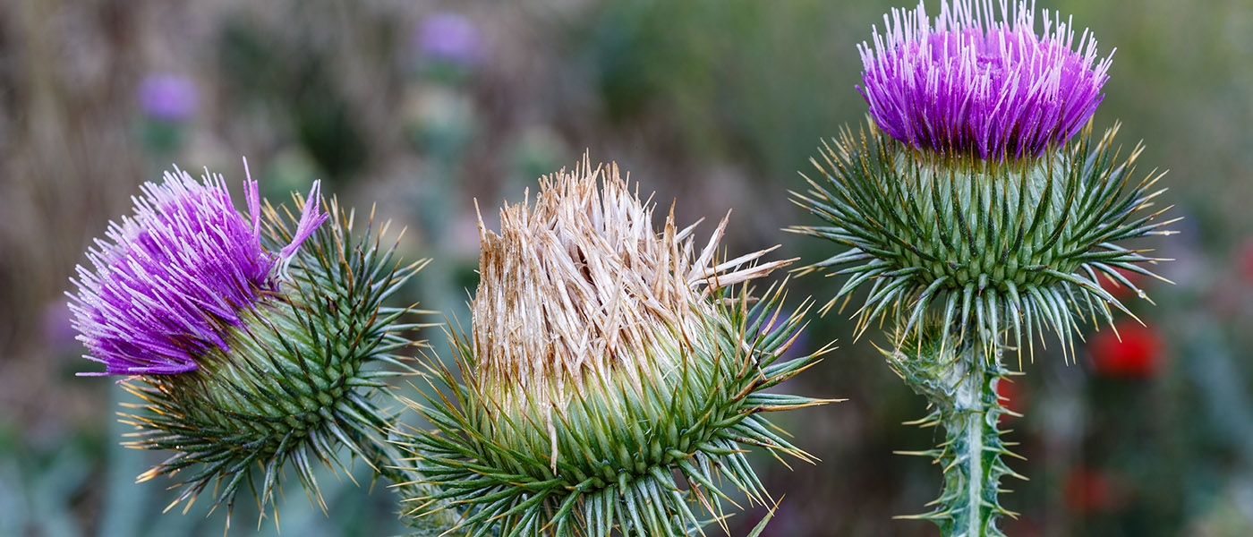To 3m. Stem yellow, pubescent, wings 2-4, with spines to 11mm. Leaves to 35x20cm, oblong-ovate to lanceolate or ovate, sessile, sinuate-dentate or pinnatilobed, lobes triangular, with apical spine to 1cm, grey-green tinged grey and sparsely lanate above. Capitula solitary or in leafy, terminal clusters of 2-7; involucre to 3x6cm; phyllaries gradually tapering to a 5mm spine, minutely pubescent; florets to 2.5cm, white or purple. Fruit 4-5mm; pappus 7-9mm, rough, pale rufescent.