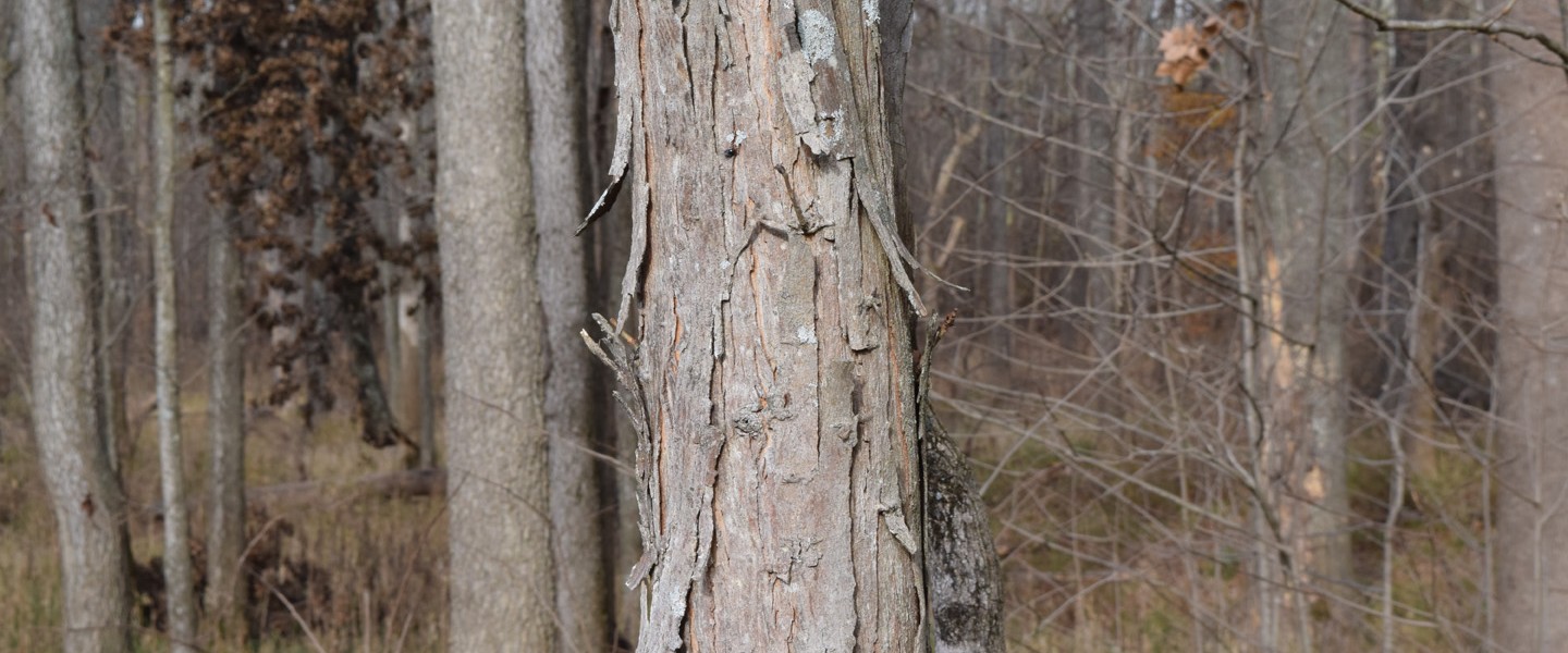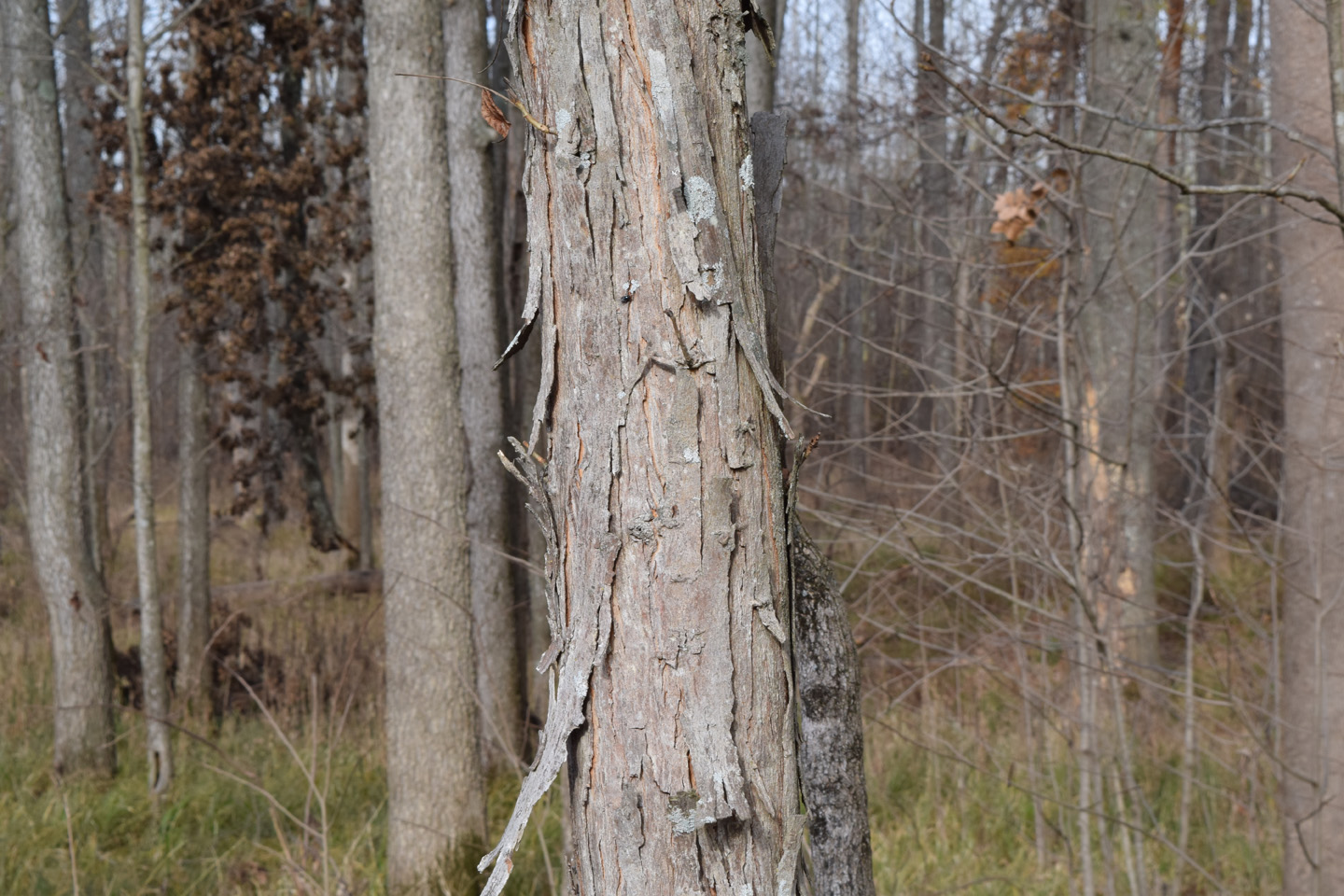 Tree reaching 60' to 80' or more in height; high branching with a straight, slender trunk, and narrow oblong crown of small spreading branches, the lower drooping, the upper ascending. The seed is sweetand edible. Possesses interesting "shaggy" bark similar to that of C. ovata.