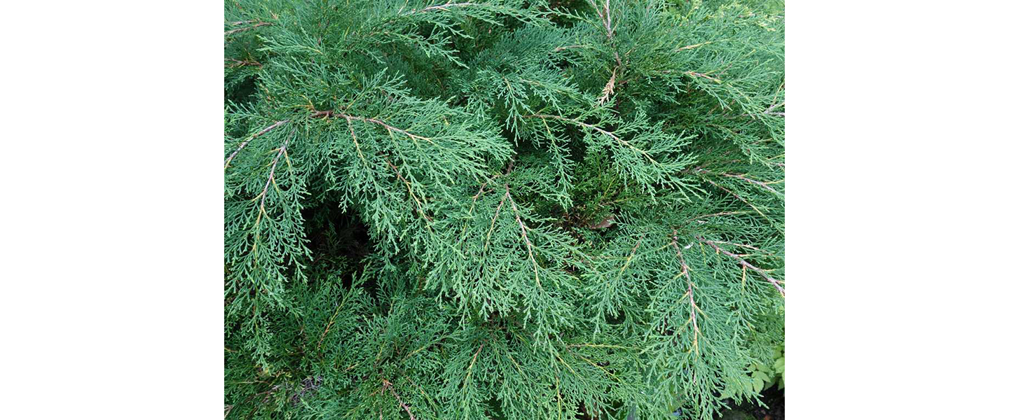 Low spreading habit, not exceeding 2' in height; a 14 year old plant measures 12" in height, and 15' in width. Produces graceful, lacy, plumed branches clad in awl-shaped leaves of rich green, which turn an attractive copper color in winter when plants are grown in full sun, and revert to green in the spring. When grown in partial shade, the green foliar color is retained all year. Highly drought tolerant.
