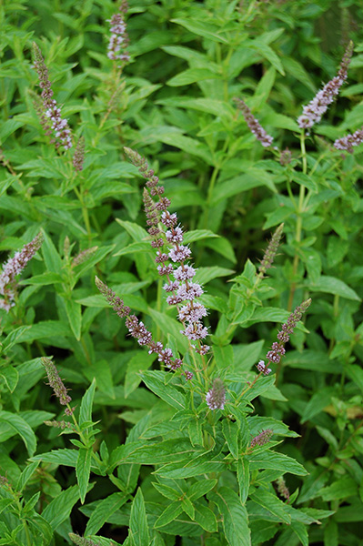 To 30" in height, glabrous, usually with a strong, sweet scent. Leaves sessile, lanceolate, to 2" long,acute, serrate, petioles about 1/16" long; inflorescence variable, calyx campanulate, glabrous or hairy, teeth nearly equal; corolla lilac, pink or white; summer blooming.