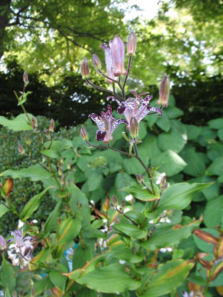 A T. formosana hybrid with very large widely-open flowers, the spider-like petals are white heavily spotted with purple, effective in September; foliage glossy green.