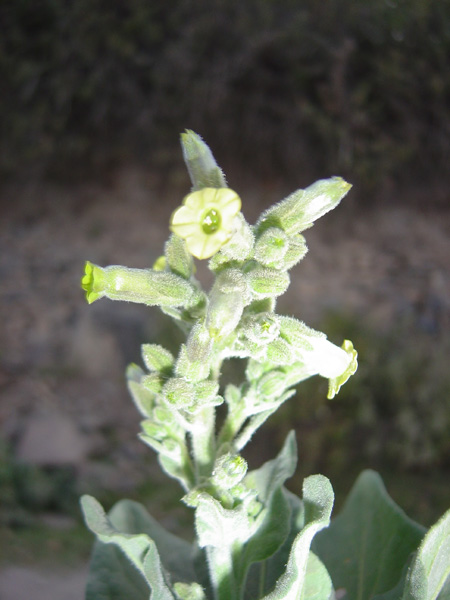 Annual, viscid-pubescent to 1.5m. Leaves ovate to ovate-obtuse or elliptic, to 30cm+; petiole unwinged. Inflorescence paniculate, lax to crowded ; flowers to 18mm, tinged yellow or green, opening during the day; calyx to 1.5cm, tubular to narrow-funnelform, dentate, teeth triangular, acute unequal; corolla to 2cm, yellow tinged green, limb to 6mm+ diamete, lobes obtuse, apex abruptly acute or obtuse; stamens 4, unequal, slightly protruding. Fruit subglobose to elliptic-ovoid, to 2cm.