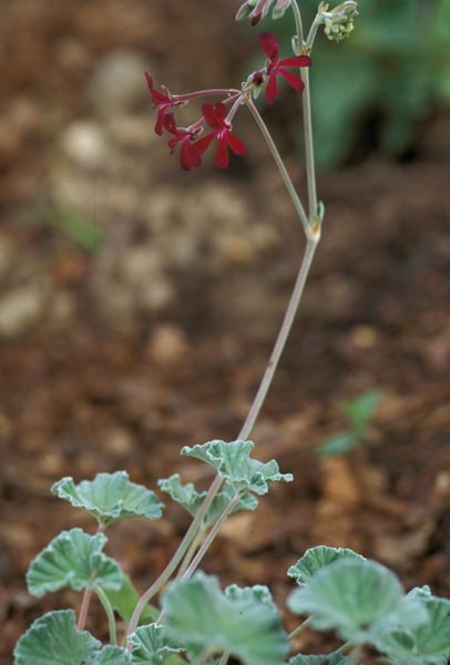 Pelargonium sidoides forms a rosette-like plant with crowded leaves. It is very similar to some forms of P. reniforme, but is easily distinguished by its blackish, rather than pink petals. The long-stalked leaves are mildly aromatic, heart-shaped and velvety. The distinctive dark, reddish-purple (almost black) flowers are present almost throughout the year, but occur mostly from late spring to summer with a peak in midsummer. The plant is an evergreen in cultivation, but it probably dies back in nature during droughts and in winter. The system of thickened underground root-like branches is a special adaptation which enables the plant to survive grass fires which occur almost annually over much of its range. It is used for a variety of folk-medicinal purposes resulting in the colloguial name 'Rabassam'.