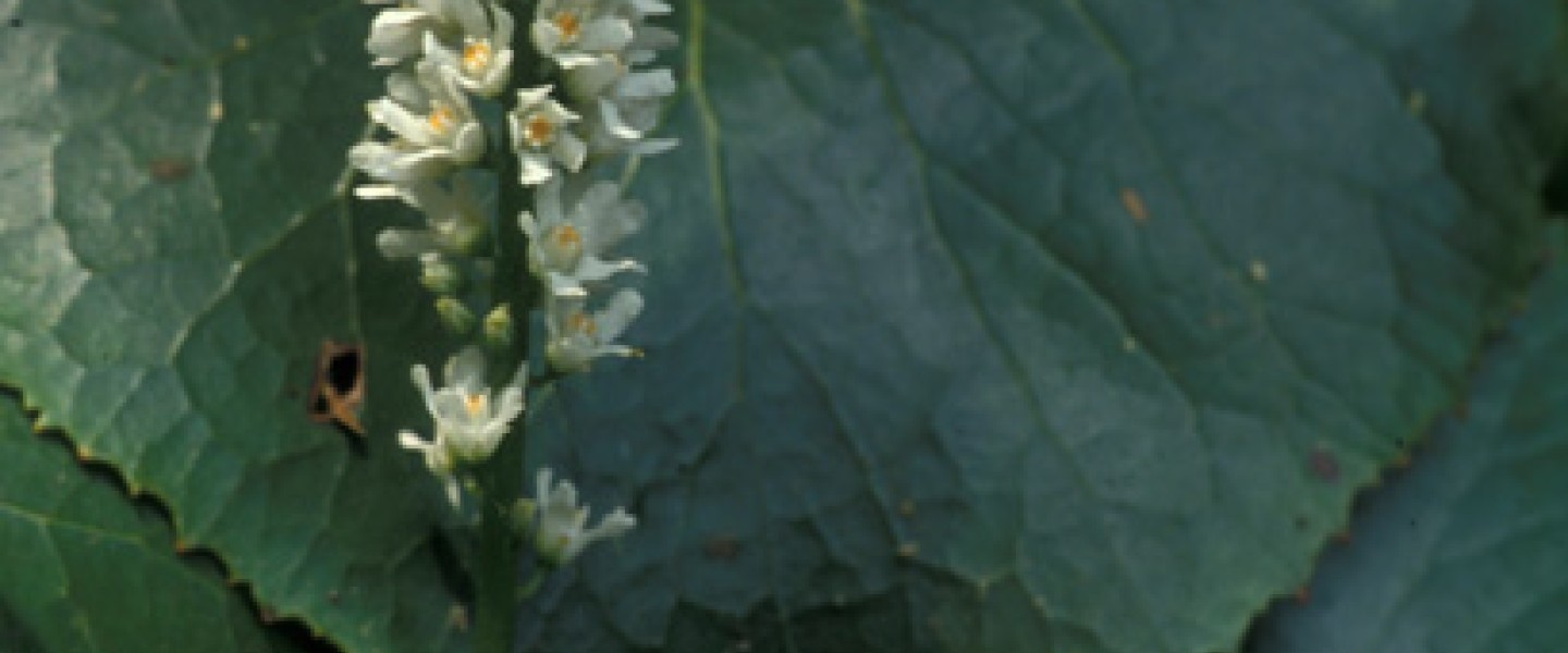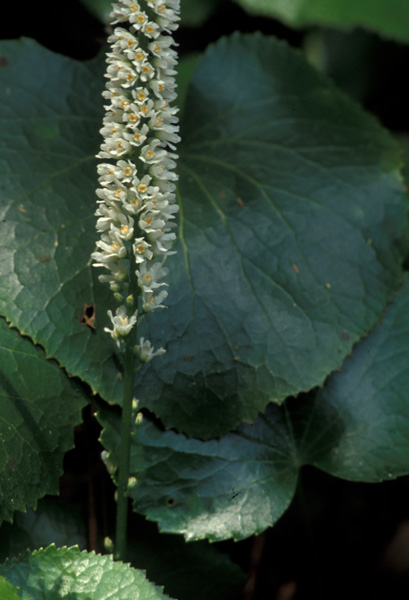 Leaves in rosettes, cordate to nearly orbicular, to 5" across, crenate-toothed, glossy, and turning purple or bronze in autumn; petioles to 9" long. Flowers white, racemes scapose, to 2 1/2' long; flowering period late spring into early summer.