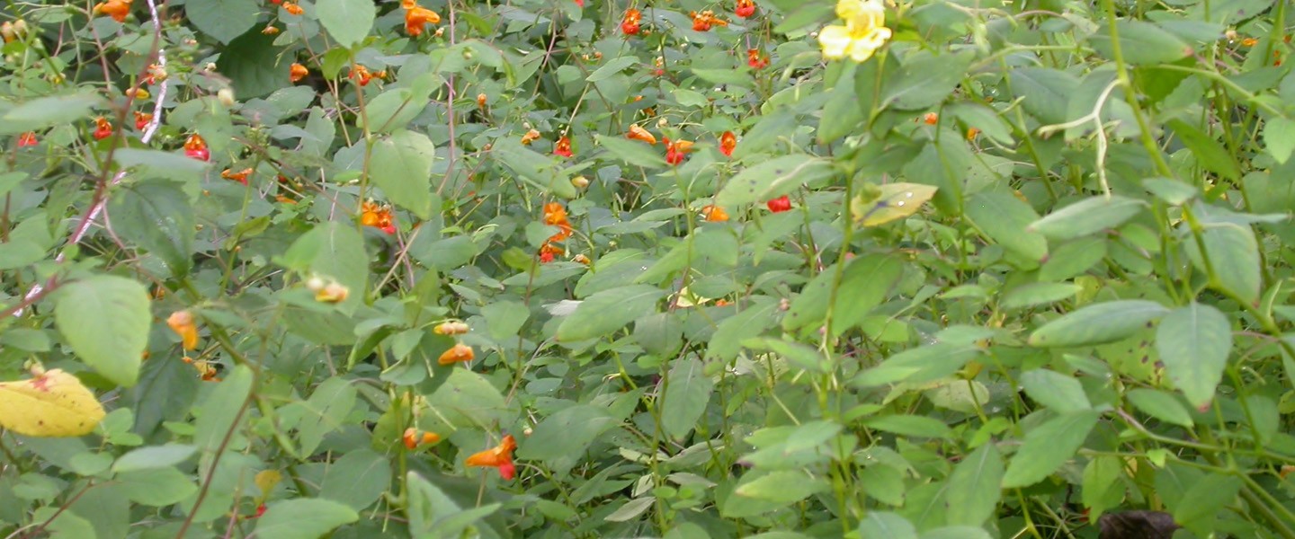 Pale jewelweed flowers primarily attract ruby-throated hummingbirds and bumblebees (Bombus spp.). The latter are especially common visitors, and sometimes "rob" nectar by perforating the spurs. Moth caterpillars feed on the foliage. Gamebirds and mice eat the seeds, which are released when seed pods explosively dehisce. White-tailed deer browse on the foliage.