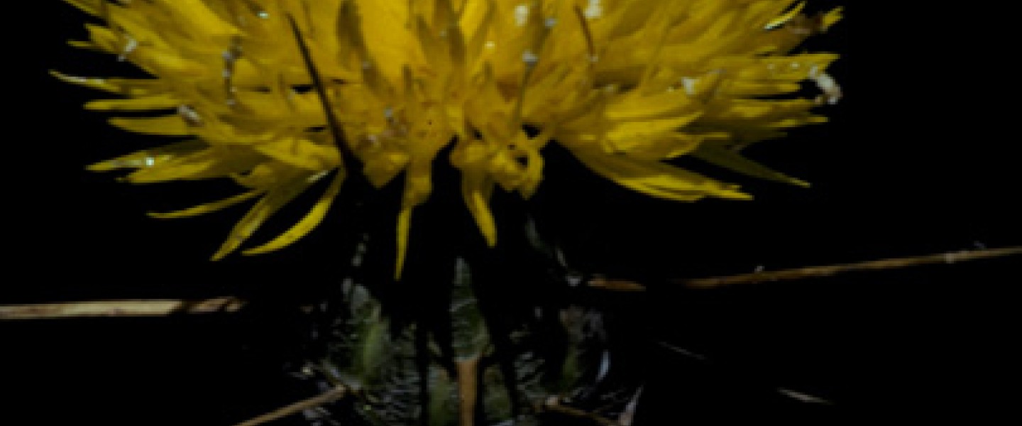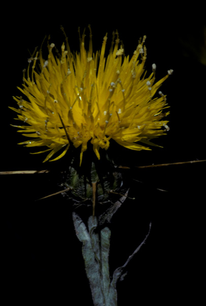 A grayish-green plant with multiple rigid stems that extend in all directions from the base, forming a bushy-looking cluster that can reach two meters in height and more than that in diameter. It produces bright yellow flowers ringed with long, sharp spines. The plant grows quickly and is very competitive. It bears a taproot that can reach a meter deep into the soil, allowing it to thrive during dry, hot summers. It is versatile in its growth patterns, and can adapt to drought or low soil moisture content by producing smaller plants with fewer seeds during dry years. Since its introduction to California in the mid-nineteenth century,[2] it has become a large-scale noxious weed throughout the United States, currently dominating over 15,000,000 acres (61,000 km2) in California alone.[3]