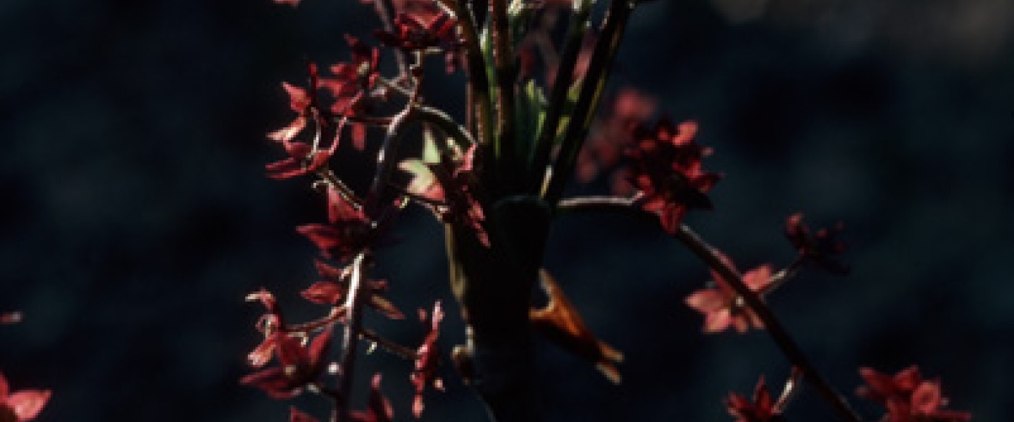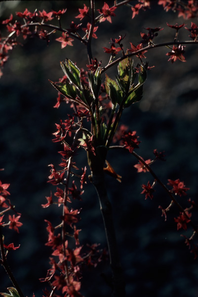 A flat-topped ground-covering shrub with erect stems and celery-like leaves that reaches 2'-3' in height. Fall color golden yellow and orange; flowers star-shaped, brownish-purple, 1/6"-1/4" across, borne on 2"-4" long racemes in March and April.