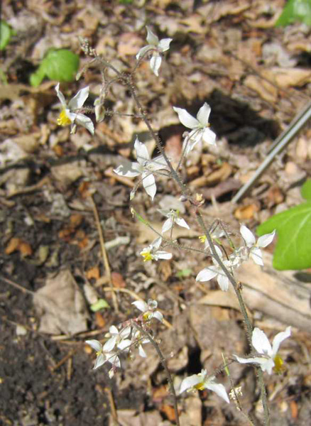 Produces an 8-10" high mass of small, rather round, heart-shaped leaflets above which rise many 10" long spikes, carrying a flurry of small, white flowers, each with short, reflexed spurs with a hint of yellow in the center. New leaflets can be mottled with reddish-purple and are thin, reminiscent of parchment paper to the touch.