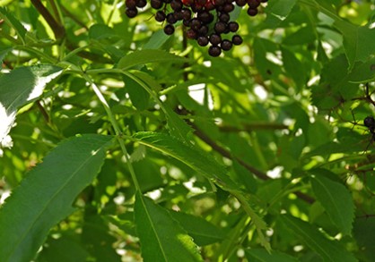 European elder, Sambucus nigra, is indigenous to much of Europe and is widespread throughout the U.K. and Ireland. Elder is a large woody shrub that bears edible dark purple berries in late summer that can be made into juice, wine, syrup, jelly, sauces, and baked into pie. The flowers, fruit, leaves, and bark have a long history of use in traditional folk medicine. The common name elder comes from the old Anglo-Saxon word aeld, meaning fire, because the hollowed-out woody stems were blown into to help ignite kindling. American elderberry, Sambucus canadensis, is indigenous to North America and has similar uses.