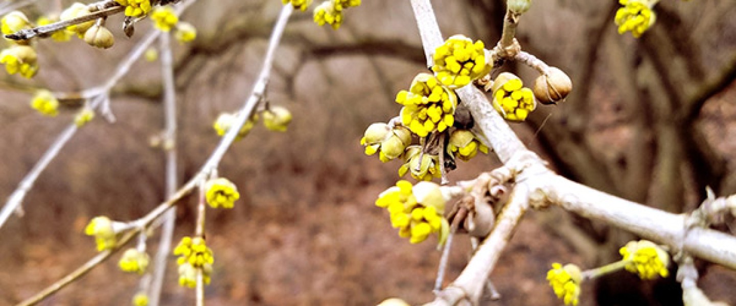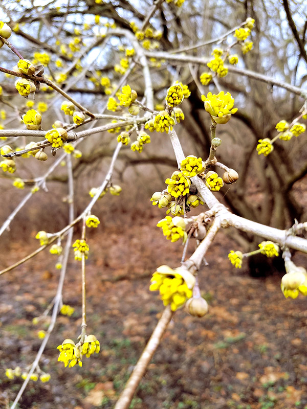 Large multi-stemmed shrub or small tree of oval-rounded outline, usually branching to the ground, reaching 20' to 25' in height and 15' to 20' in width. Foliage dark green, somewhat glossy with poor fall color, the leaves usually falling while green, although they can assume purplish red color. Flowers yellow, borne in March, effective for three weeks, borne in short-stalked 3/4" diameter umbels. Fruit a bright, cherry-red, oblong, 5/8" long, 1/2" wide drupe, ripening in July, often hidden by the foliage. Bark exfoliating, flaky, often gray-brown to rich brown, rather attractive, but not as showy as C. officinalis.