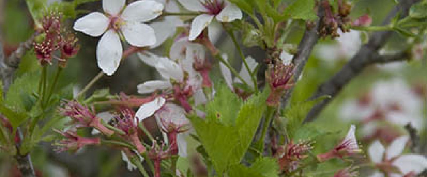 Generally shrubby, but occasionally a small tree, blooming profusely in March. Leaves small, inciselytoothed, beautifully tinted in autumn. Flowers small, white, pink tinged in bud and appearing pink at adistance; fruits only occasionally produced, small, purple-black.