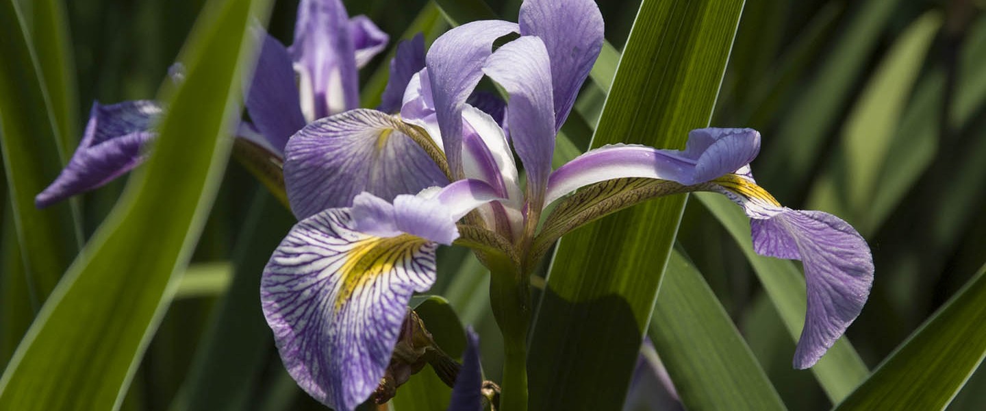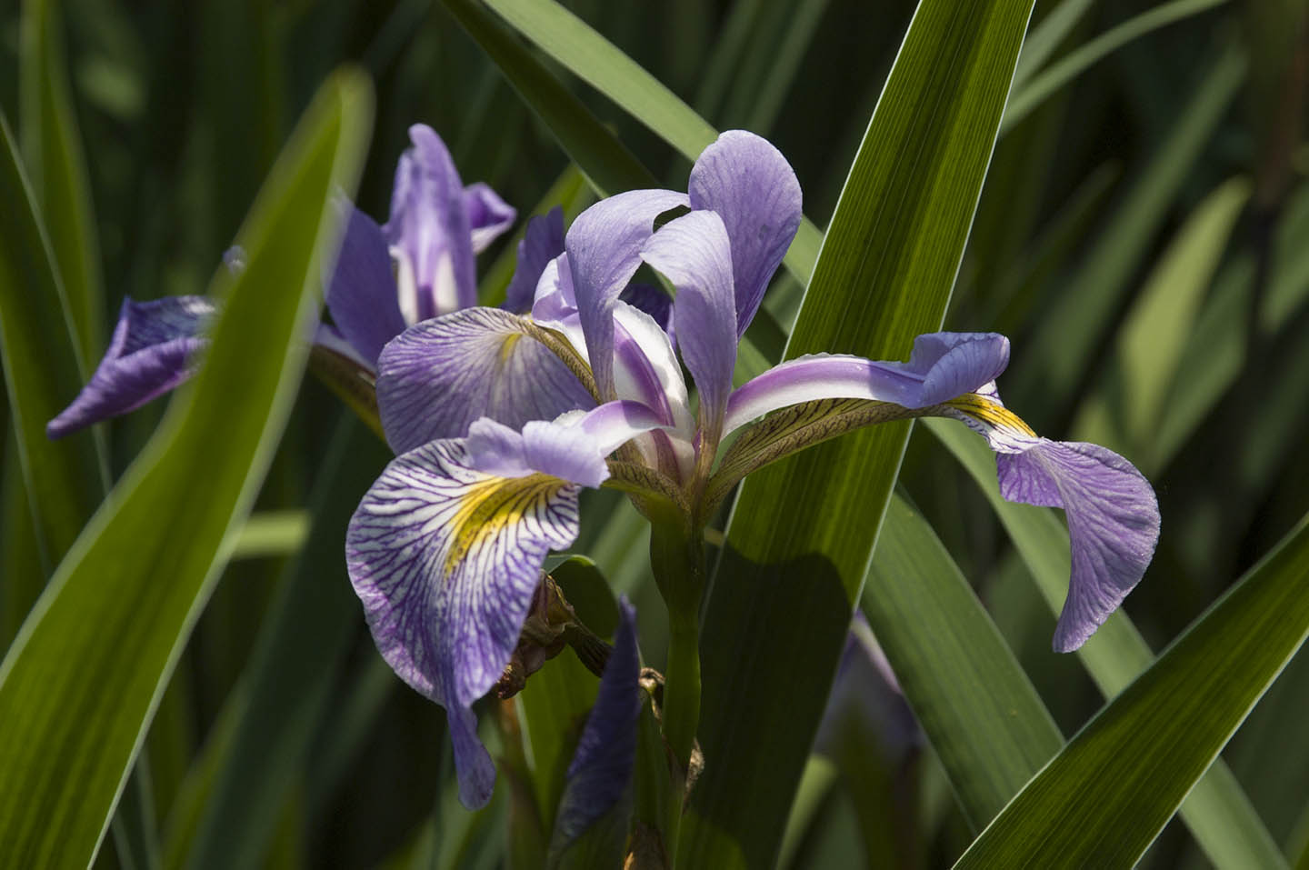 Stems purple; leaves richly colored with purple at the base; flowers blue. (DS350) Rhizomatous perennial to 1.2m tall, with arching, narrow leaves and purplish stems bearing 3-4 violet-purple flowers, the falls whitish at the base with a yellow flash and dark veins. (DS 628)