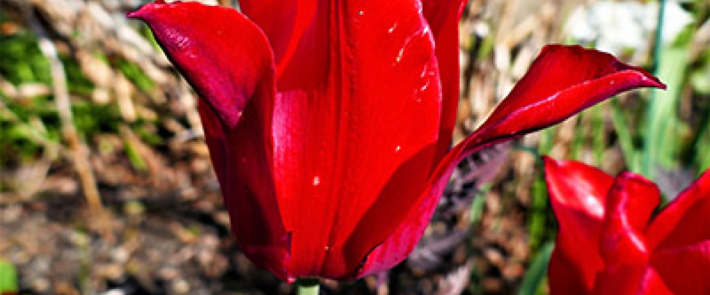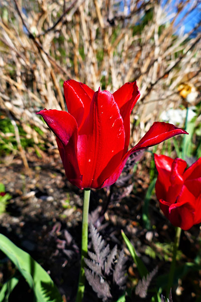 This blood red lily flowering tulip almost seems luminescent as it stands tall above the garden. The pointed petals of the Pieter de Leur Lily Flowering Tulip slightly bend outward, giving the tulip a somewhat open look for much of its bloomtime.