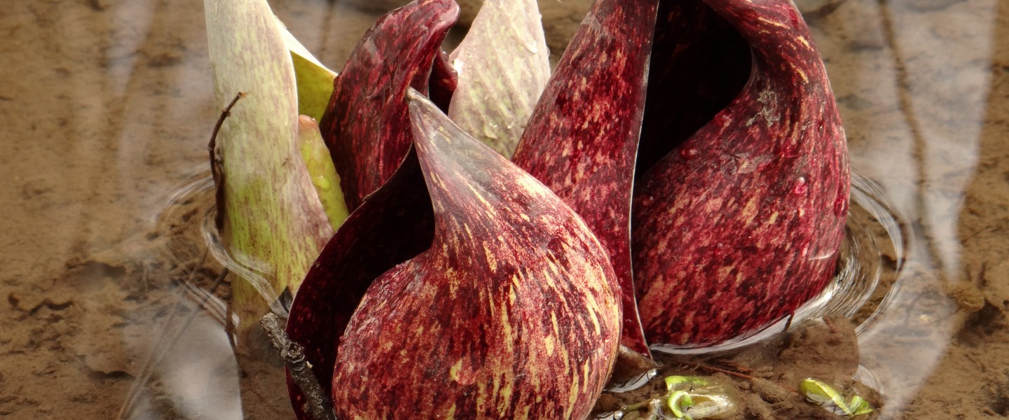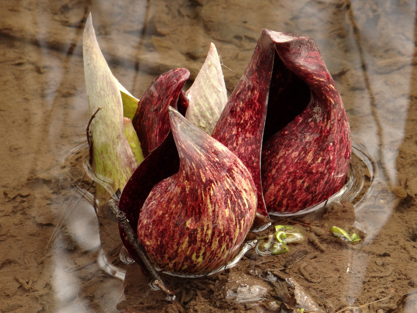 The colorful flower spathe is a warm refuge for insects in early spring. The carrion-like scent of the flowers attracts flies that lay their eggs in the flower and inadvertently cause cross-pollination. Slugs and snails occasionally feed on the foliage, while spiders take up residence inside the spathe to ambush visiting insects. Most herbivores avoid skunk cabbage foliage, but hungry black bears and snapping turtles may sample the leaves in early spring when they come out of hibernation. Wood ducks, ruffed grouse, ring-necked pheasants, and bobwhite quail eat skunk cabbage seeds.